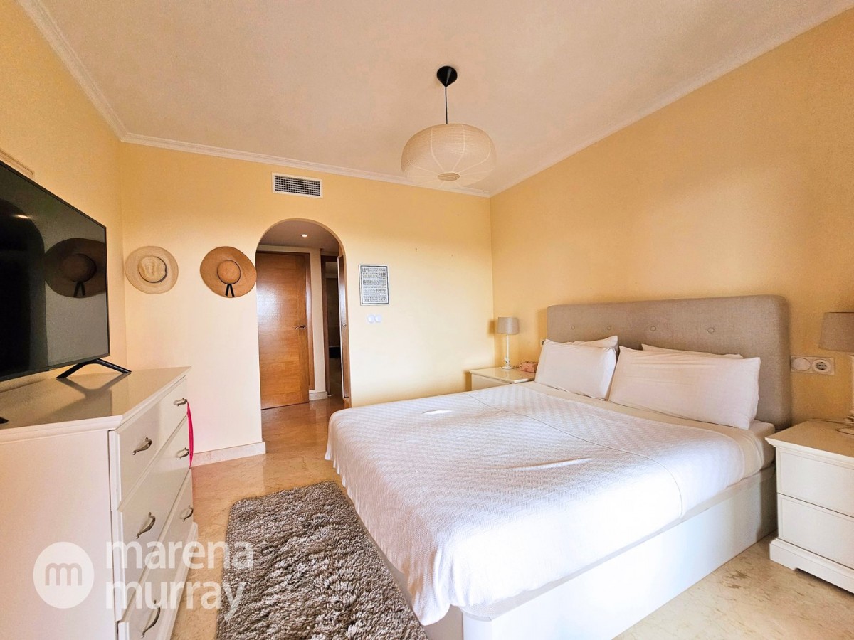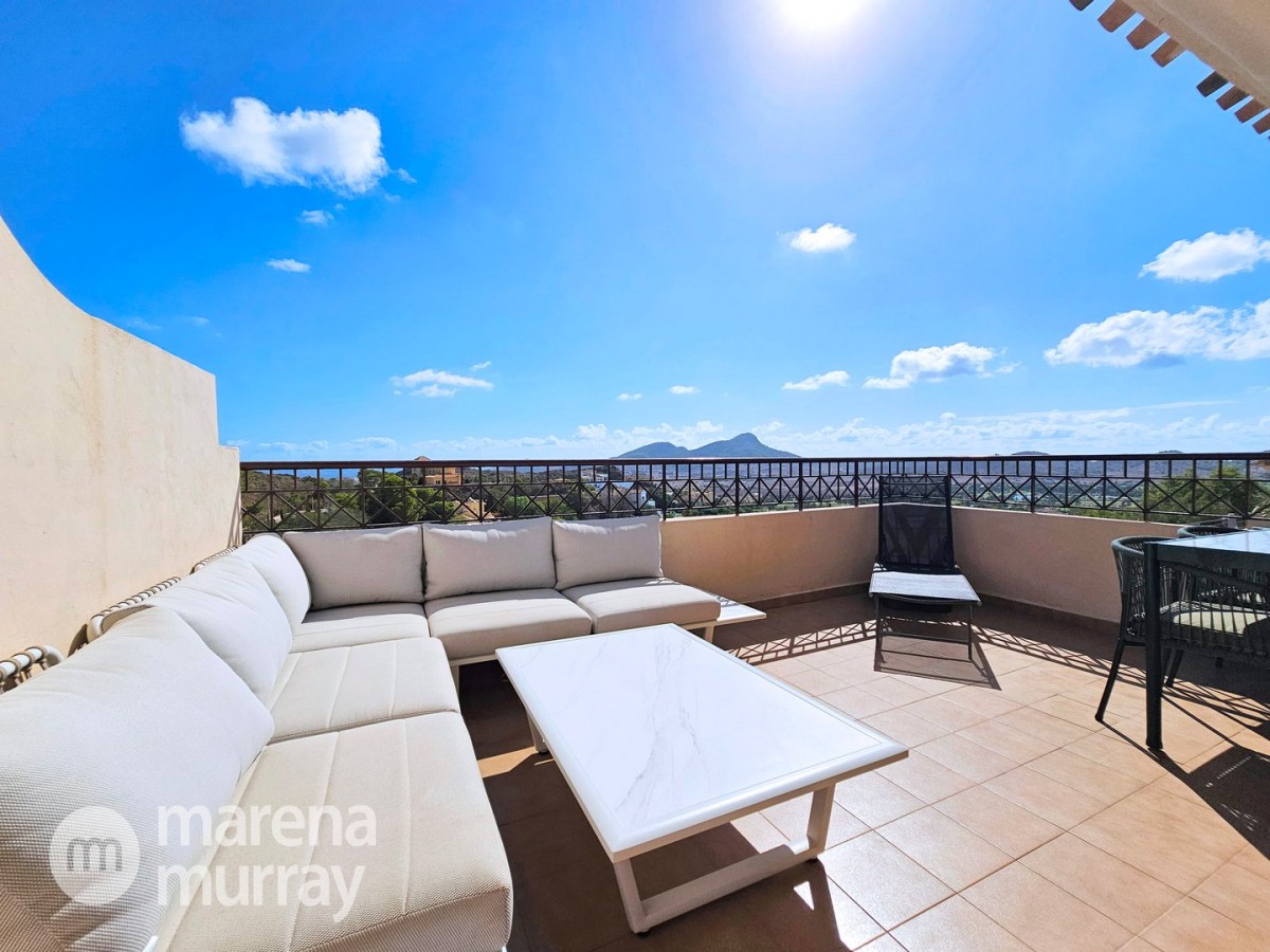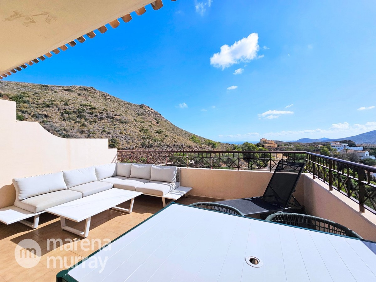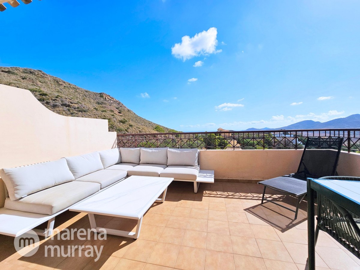 In a quiet spot in La Manga Club, this duplex apartment in the Buena Vista community, is the perfect spot for a holiday home or relocation property. This duplex apartment has on the lower level two large double bedrooms, both ensuite, with the master having its down dressing room area. Both bedrooms have access to a large private terrace looking toward the hills of Calblanque national park. The entrance level of the apartment leads through to a well-equipped, good size kitchen with pass-through to the lounge/diner. This is a perfect spot for entertaining guests and hosting family and friends in the open plan living area with step free access onto another terrace which has views of La Manga del Mar Menor, Calblanque, and the golf greens of the resort. With this property you have access to a community pool exclusively for the Buena Vista apartments, and an allocated parking space for the property just outside. The benefit of being on the north side of the resort allows for much winter sun and a quieter community.