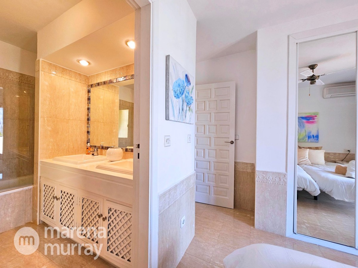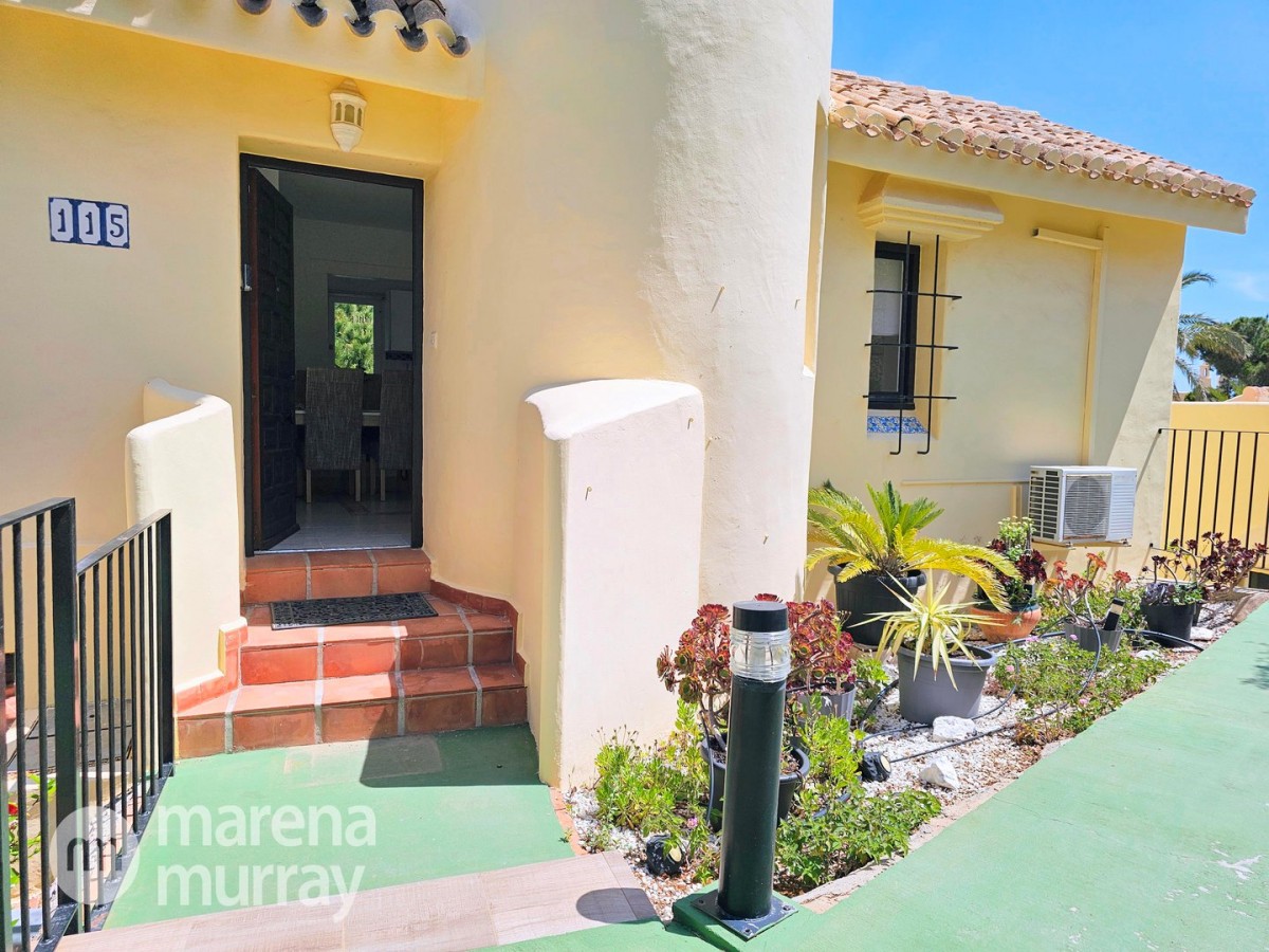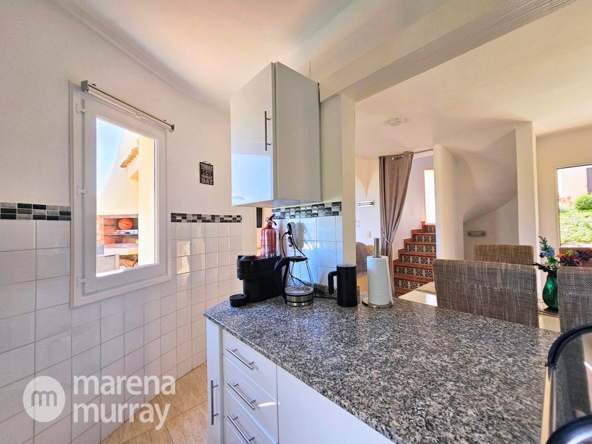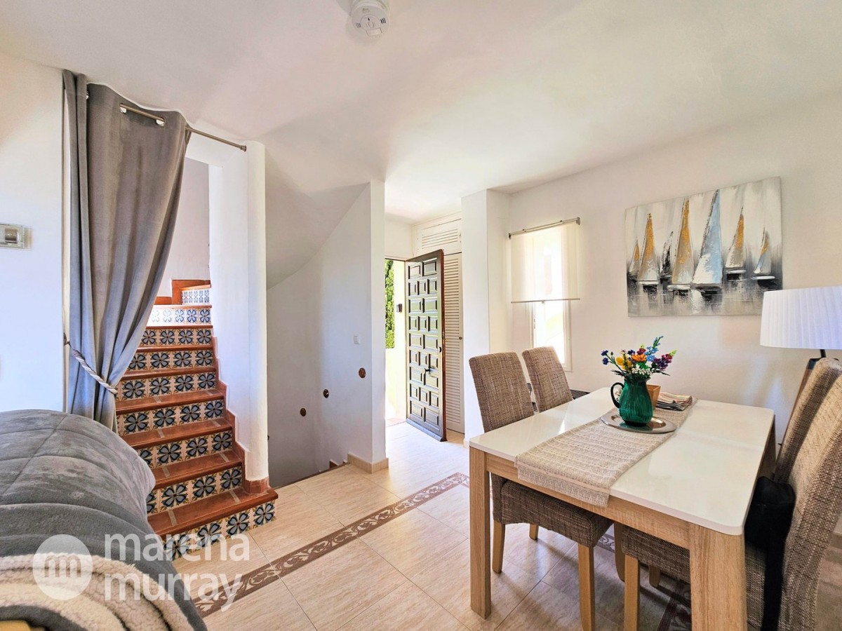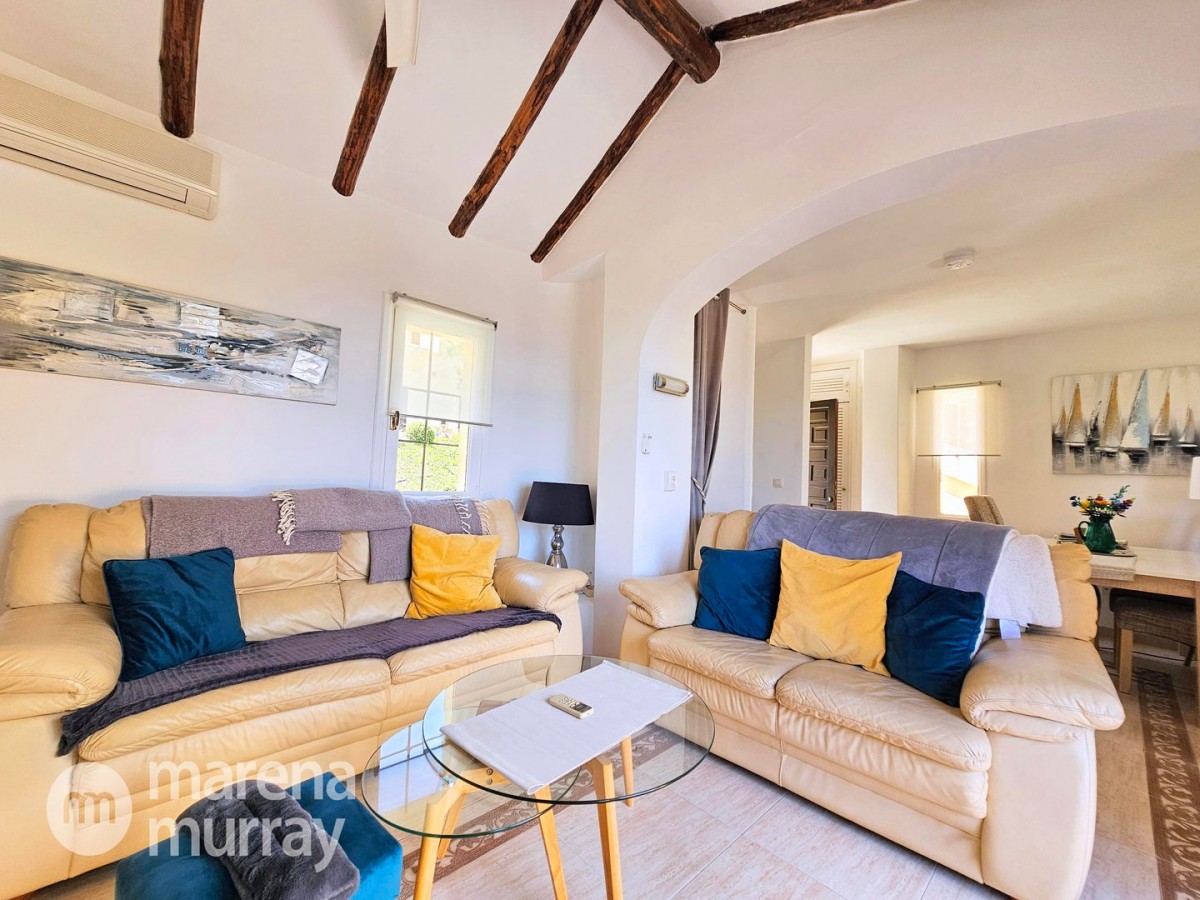 Located in the quiet community of Los Molinos, this well-maintained two-bedroom villa offers comfortable living in the heart of La Manga Club. The property features high-quality finishes, including marble flooring and exposed beamed ceilings, creating a bright and welcoming atmosphere. The open-plan living and dining area leads directly onto a sunny terrace with a built-in barbecue, ideal for outdoor meals and relaxing in a peaceful setting. The modern kitchen includes a practical pass through to the dining area, making serving easy and efficient. There are two spacious double bedrooms and two bathrooms, offering plenty of room for family or guests. A private rooftop solarium provides excellent views over La Manga Club and the Mar Menor, and is perfect for enjoying the sun year-round. The villa is close to the large communal swimming pool, a separate children's pool, and a seasonal pool bar and restaurant. Parking is conveniently located nearby. This property is a great option for a holiday home, rental investment, or full-time residence in a popular area of the resort.