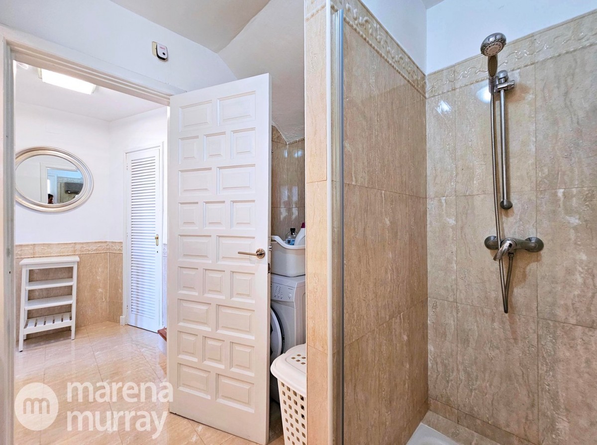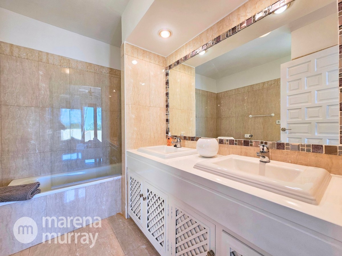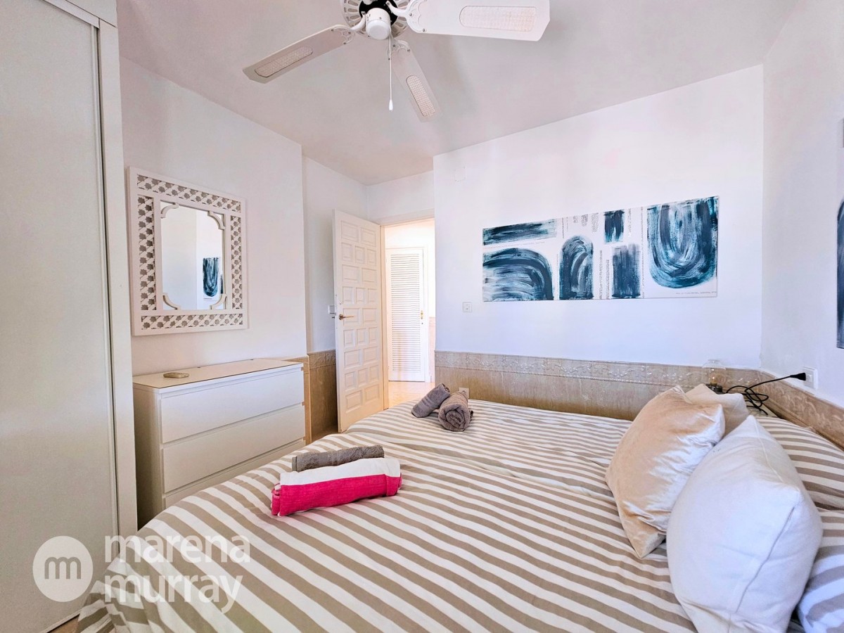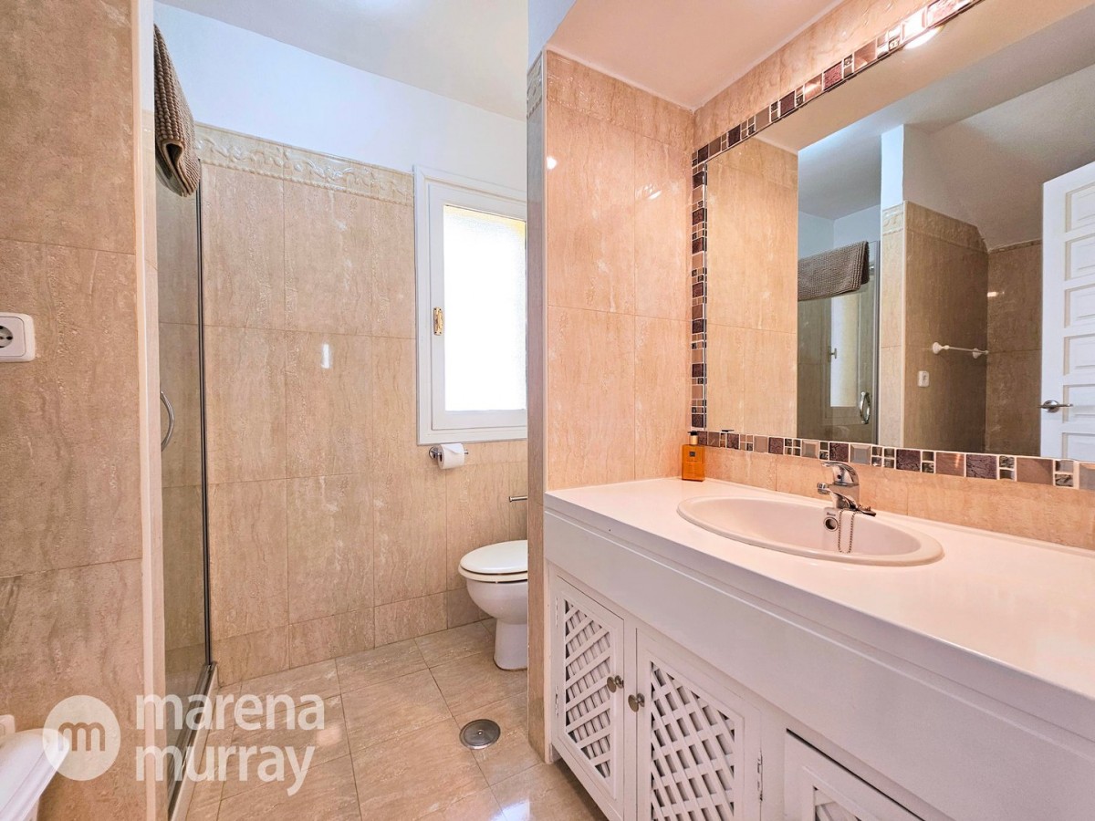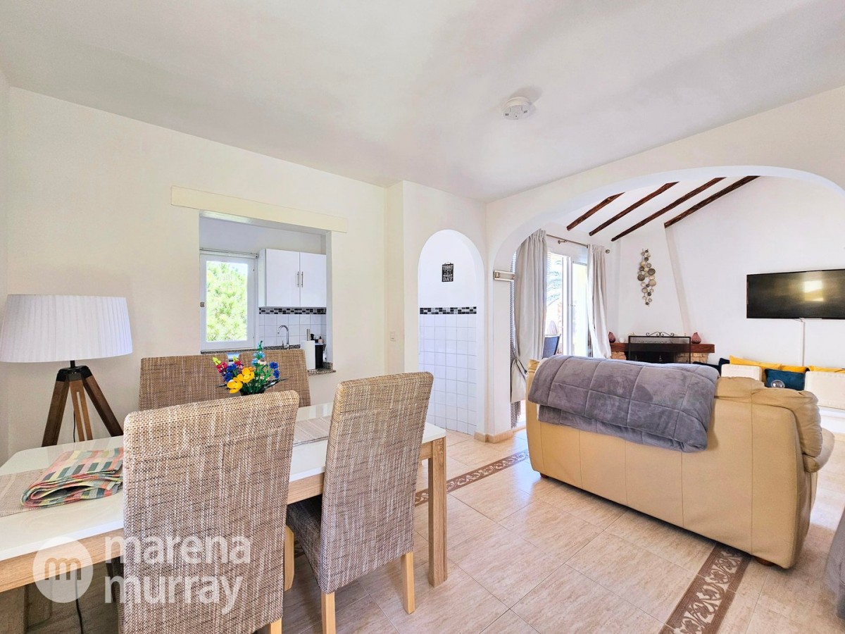Located in the quiet community of Los Molinos, this well-maintained two-bedroom villa offers comfortable living in the heart of La Manga Club. The property features high-quality finishes, including marble flooring and exposed beamed ceilings, creating a bright and welcoming atmosphere. The open-plan living and dining area leads directly onto a sunny terrace with a built-in barbecue, ideal for outdoor meals and relaxing in a peaceful setting. The modern kitchen includes a practical pass through to the dining area, making serving easy and efficient. There are two spacious double bedrooms and two bathrooms, offering plenty of room for family or guests. A private rooftop solarium provides excellent views over La Manga Club and the Mar Menor, and is perfect for enjoying the sun year-round. The villa is close to the large communal swimming pool, a separate children's pool, and a seasonal pool bar and restaurant. Parking is conveniently located nearby. This property is a great option for a holiday home, rental investment, or full-time residence in a popular area of the resort.