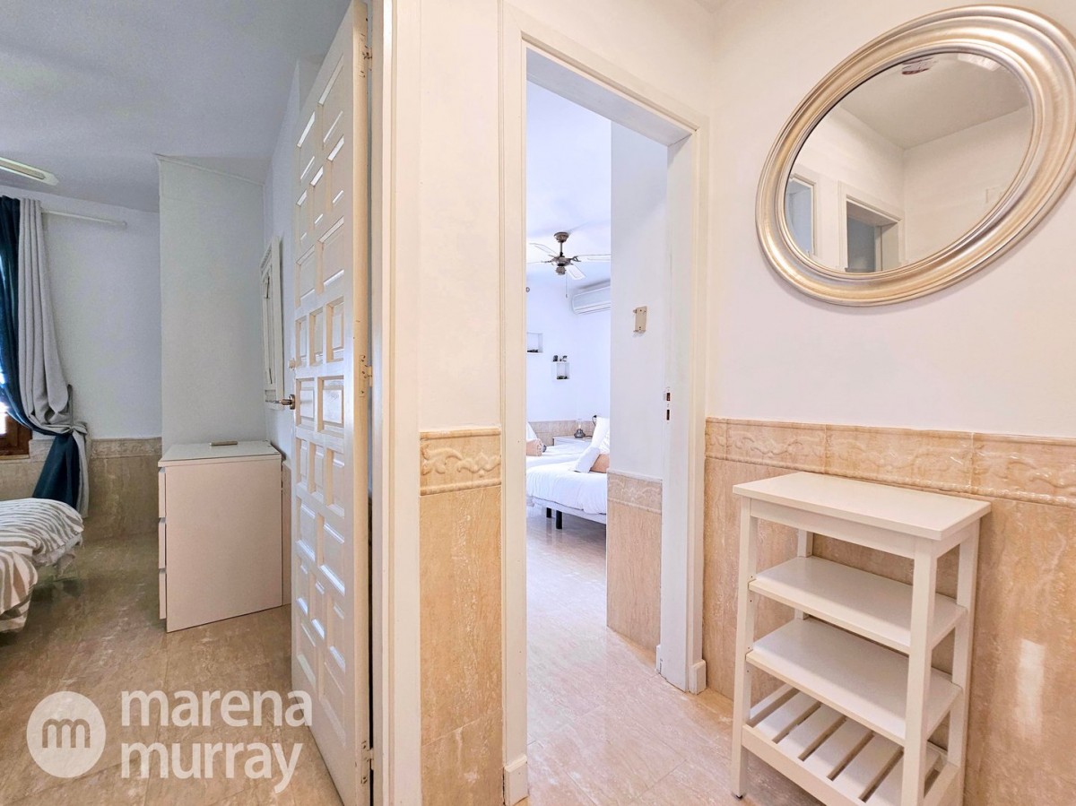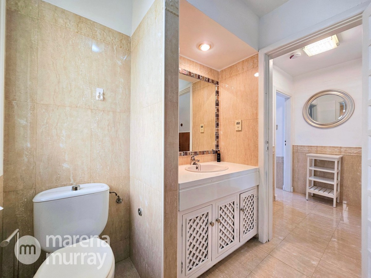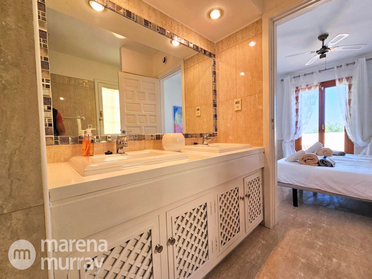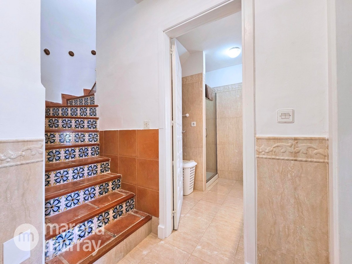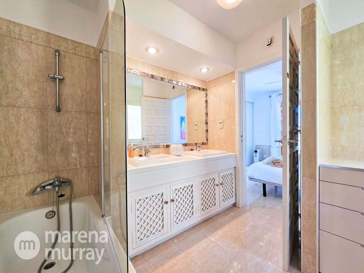 Located in the quiet community of Los Molinos, this well-maintained two-bedroom villa offers comfortable living in the heart of La Manga Club. The property features high-quality finishes, including marble flooring and exposed beamed ceilings, creating a bright and welcoming atmosphere. The open-plan living and dining area leads directly onto a sunny terrace with a built-in barbecue, ideal for outdoor meals and relaxing in a peaceful setting. The modern kitchen includes a practical pass through to the dining area, making serving easy and efficient. There are two spacious double bedrooms and two bathrooms, offering plenty of room for family or guests. A private rooftop solarium provides excellent views over La Manga Club and the Mar Menor, and is perfect for enjoying the sun year-round. The villa is close to the large communal swimming pool, a separate children's pool, and a seasonal pool bar and restaurant. Parking is conveniently located nearby. This property is a great option for a holiday home, rental investment, or full-time residence in a popular area of the resort.