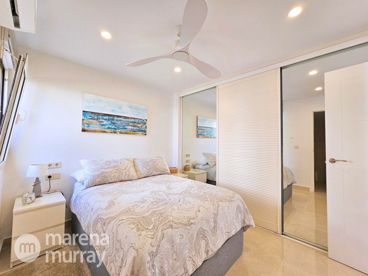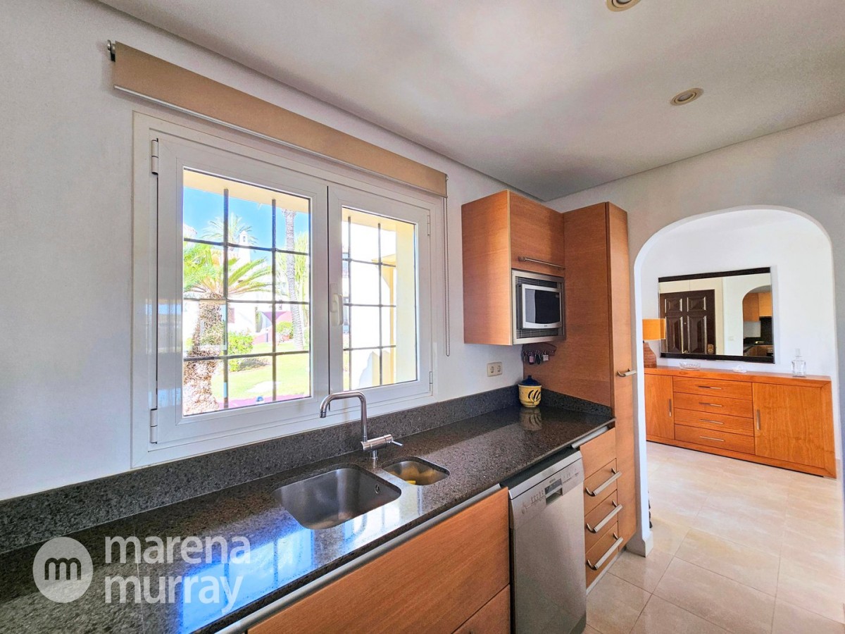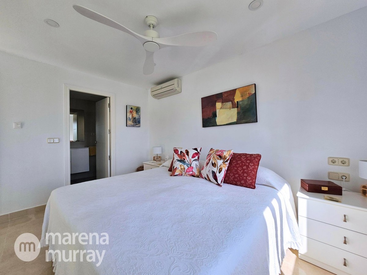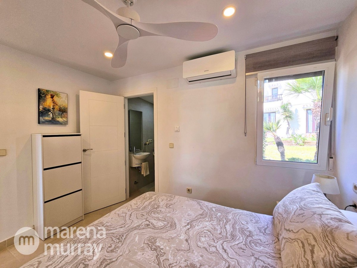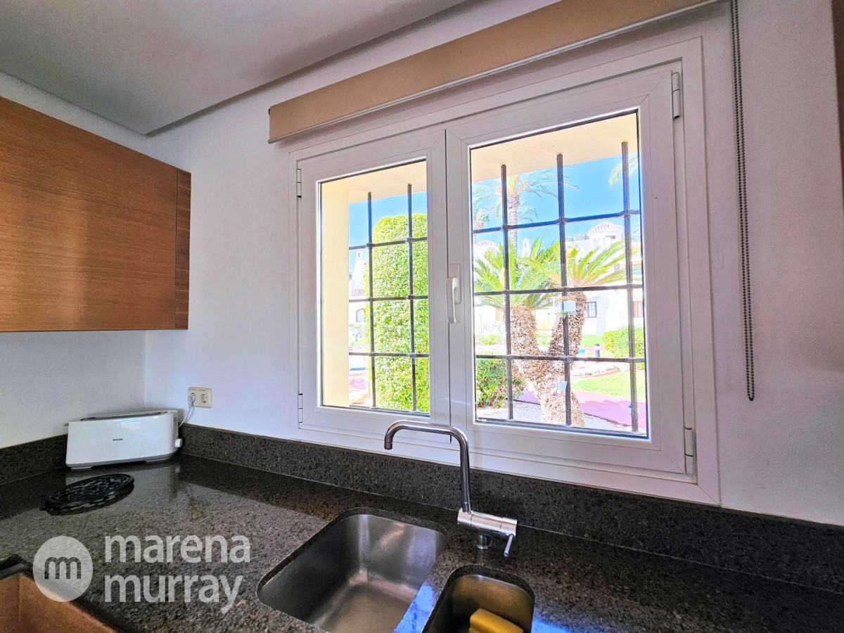 Located in the sought after El Rancho community within the heart of La Manga Club, this beautifully presented property offers modern living with convenience, comfort, and stunning surroundings. With easy access and parking just metres from the door, the property features step-free entry, perfect for all ages and abilities. Step inside to a spacious and contemporary lounge-diner, thoughtfully designed for entertaining family and friends. The open-plan layout includes a modern kitchen fitted with high end appliances and a feature wall opening to the living area, allowing for a social and connected feel throughout the home. There are two generously sized bedrooms, both offering ample storage. The master bedroom boasts a large ensuite bathroom complete with a walk-in shower. The spacious private sun terrace enjoys plentiful sunshine and overlooks the lush, well-maintained community gardens, ideal for relaxing or dining al fresco. An additional highlight is the rooftop solarium, which benefits from all-day sun, year round, and offers views of the surrounding hills of Calblanque National Park. El Rancho is renowned for its charming landscaped gardens and nine swimming pools, each with an adjoining children’s pool, offering a peaceful, family-friendly atmosphere. Situated just a short walk from the lively Bellaluz Plaza, home to a selection of year round restaurants and bars, and within close reach of the newly refurbished tennis and padel club.