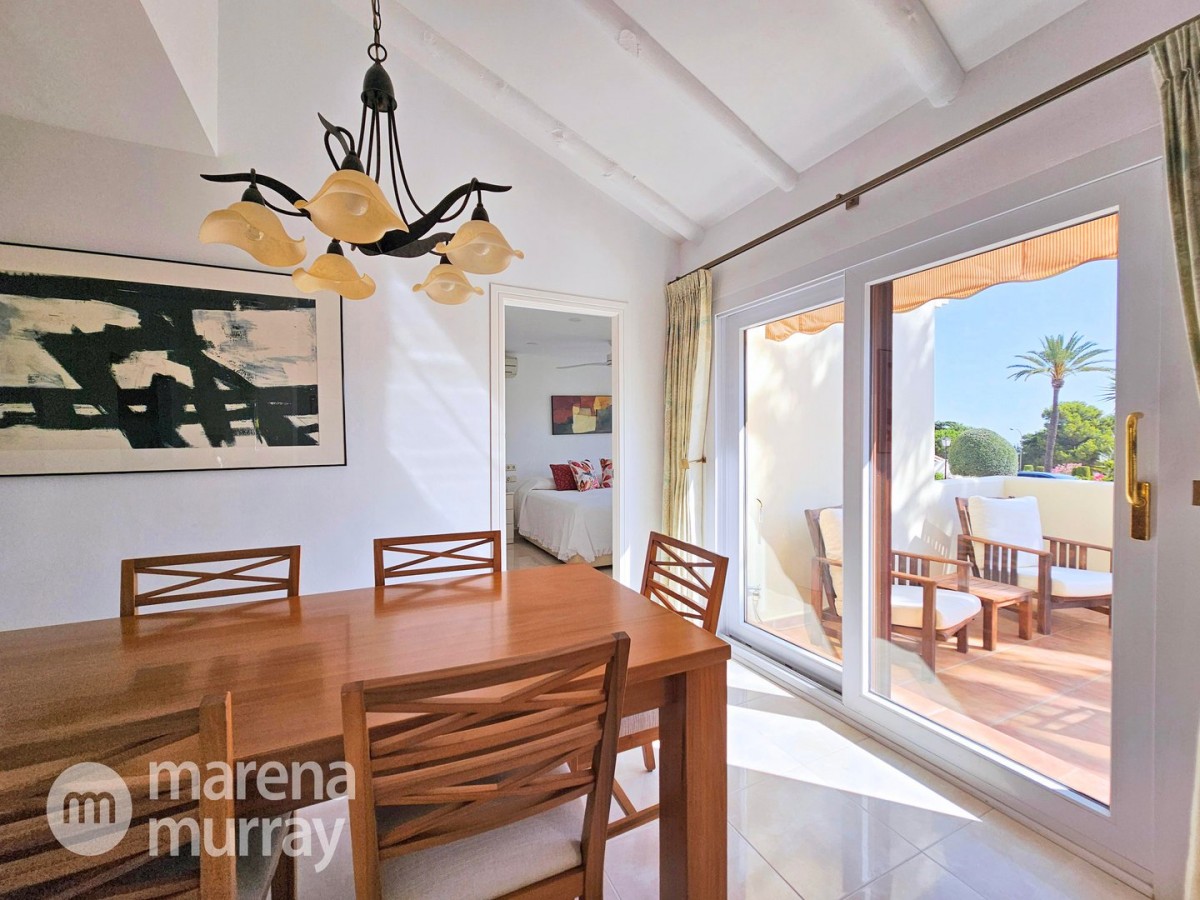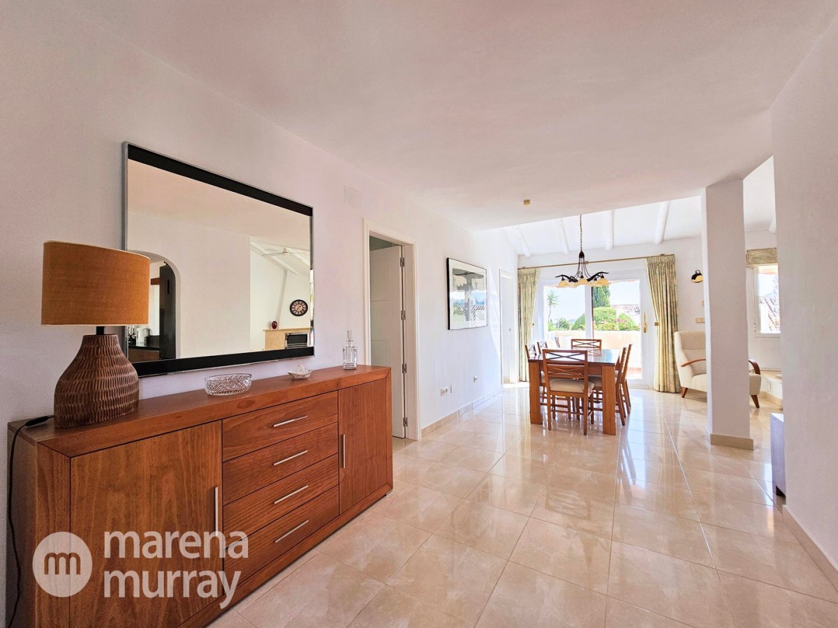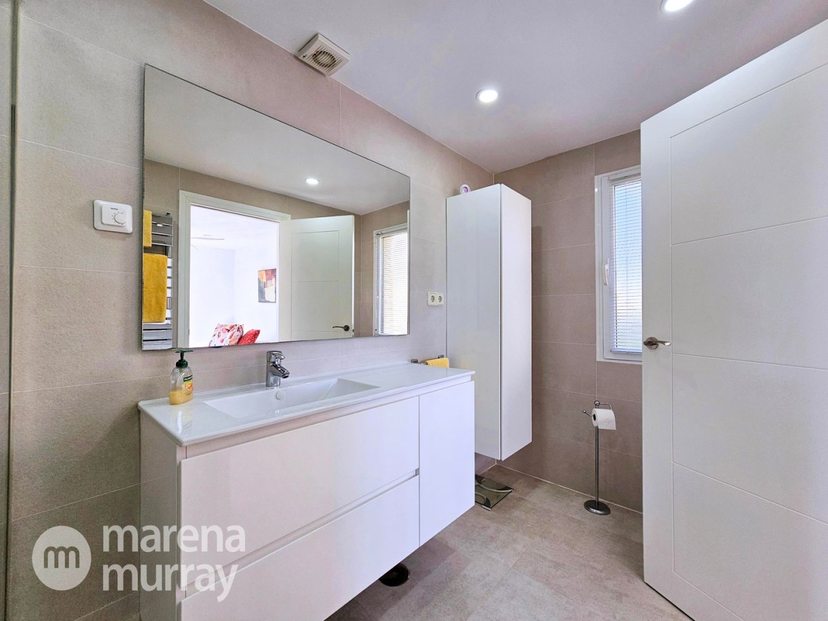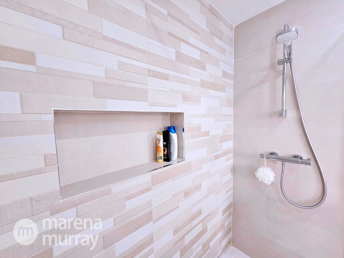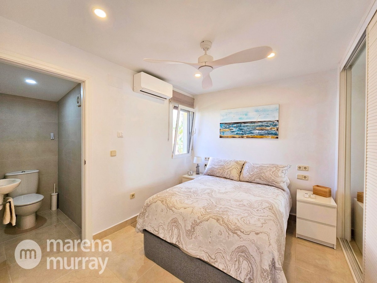 Located in the sought after El Rancho community within the heart of La Manga Club, this beautifully presented property offers modern living with convenience, comfort, and stunning surroundings. With easy access and parking just metres from the door, the property features step-free entry, perfect for all ages and abilities. Step inside to a spacious and contemporary lounge-diner, thoughtfully designed for entertaining family and friends. The open-plan layout includes a modern kitchen fitted with high end appliances and a feature wall opening to the living area, allowing for a social and connected feel throughout the home. There are two generously sized bedrooms, both offering ample storage. The master bedroom boasts a large ensuite bathroom complete with a walk-in shower. The spacious private sun terrace enjoys plentiful sunshine and overlooks the lush, well-maintained community gardens, ideal for relaxing or dining al fresco. An additional highlight is the rooftop solarium, which benefits from all-day sun, year round, and offers views of the surrounding hills of Calblanque National Park. El Rancho is renowned for its charming landscaped gardens and nine swimming pools, each with an adjoining children’s pool, offering a peaceful, family-friendly atmosphere. Situated just a short walk from the lively Bellaluz Plaza, home to a selection of year round restaurants and bars, and within close reach of the newly refurbished tennis and padel club.