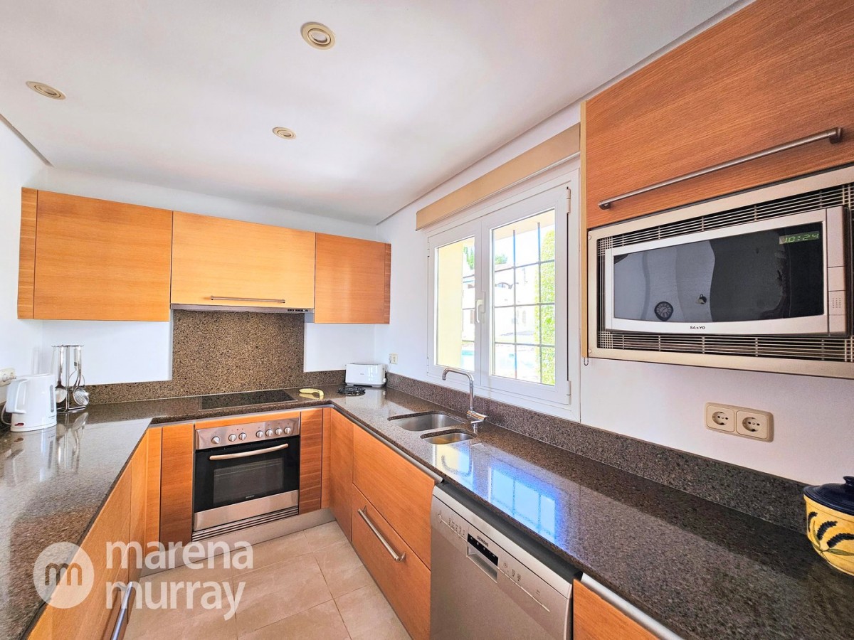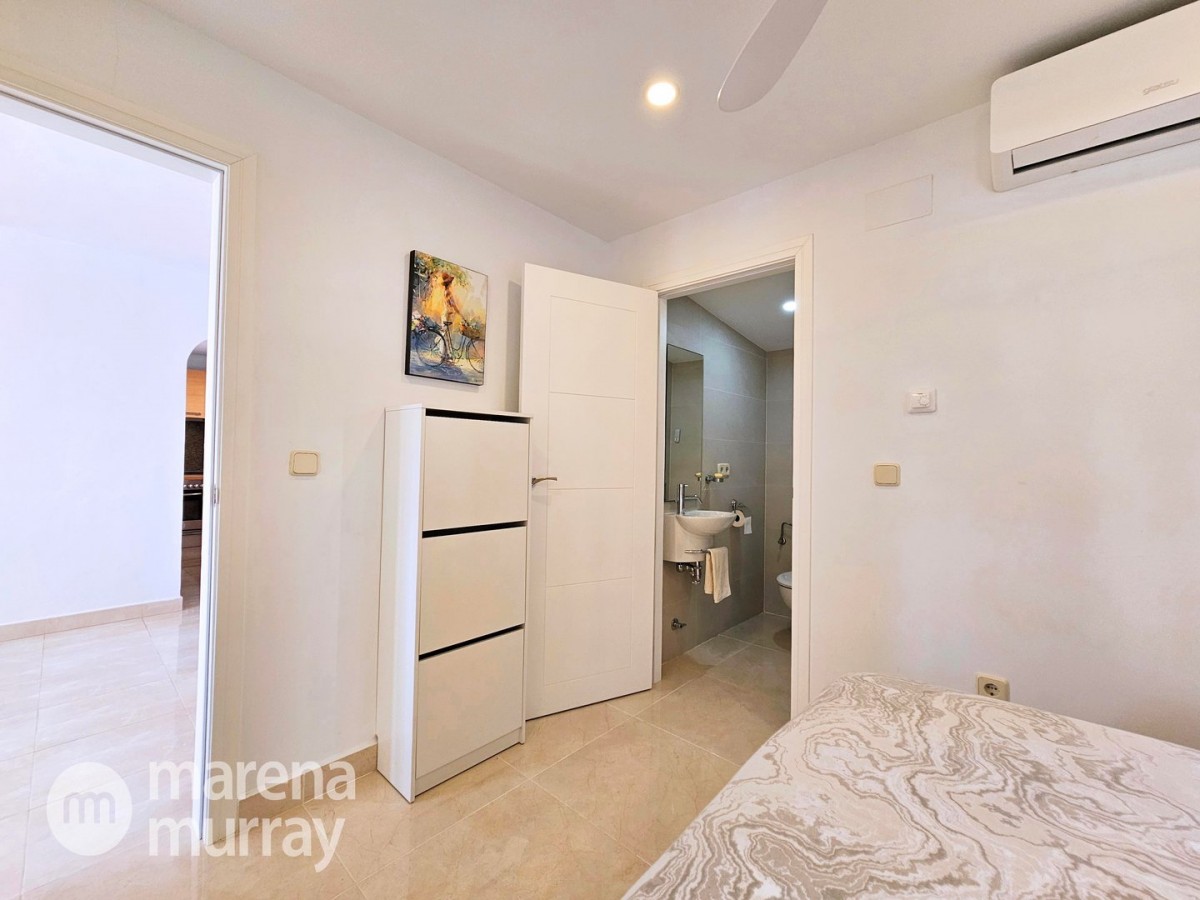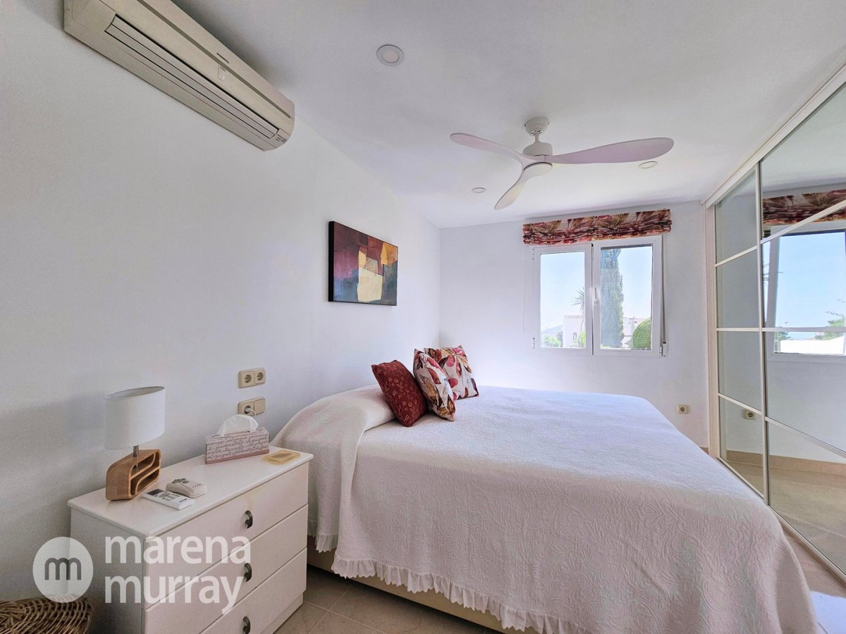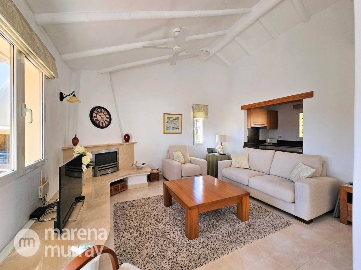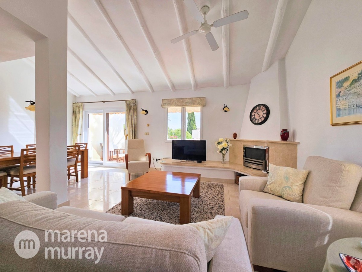 Located in the sought after El Rancho community within the heart of La Manga Club, this beautifully presented property offers modern living with convenience, comfort, and stunning surroundings. With easy access and parking just metres from the door, the property features step-free entry, perfect for all ages and abilities. Step inside to a spacious and contemporary lounge-diner, thoughtfully designed for entertaining family and friends. The open-plan layout includes a modern kitchen fitted with high end appliances and a feature wall opening to the living area, allowing for a social and connected feel throughout the home. There are two generously sized bedrooms, both offering ample storage. The master bedroom boasts a large ensuite bathroom complete with a walk-in shower. The spacious private sun terrace enjoys plentiful sunshine and overlooks the lush, well-maintained community gardens, ideal for relaxing or dining al fresco. An additional highlight is the rooftop solarium, which benefits from all-day sun, year round, and offers views of the surrounding hills of Calblanque National Park. El Rancho is renowned for its charming landscaped gardens and nine swimming pools, each with an adjoining children’s pool, offering a peaceful, family-friendly atmosphere. Situated just a short walk from the lively Bellaluz Plaza, home to a selection of year round restaurants and bars, and within close reach of the newly refurbished tennis and padel club.