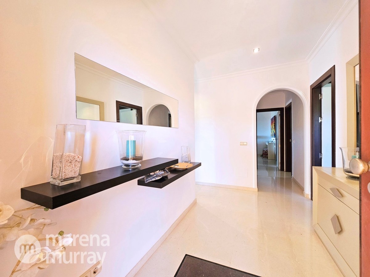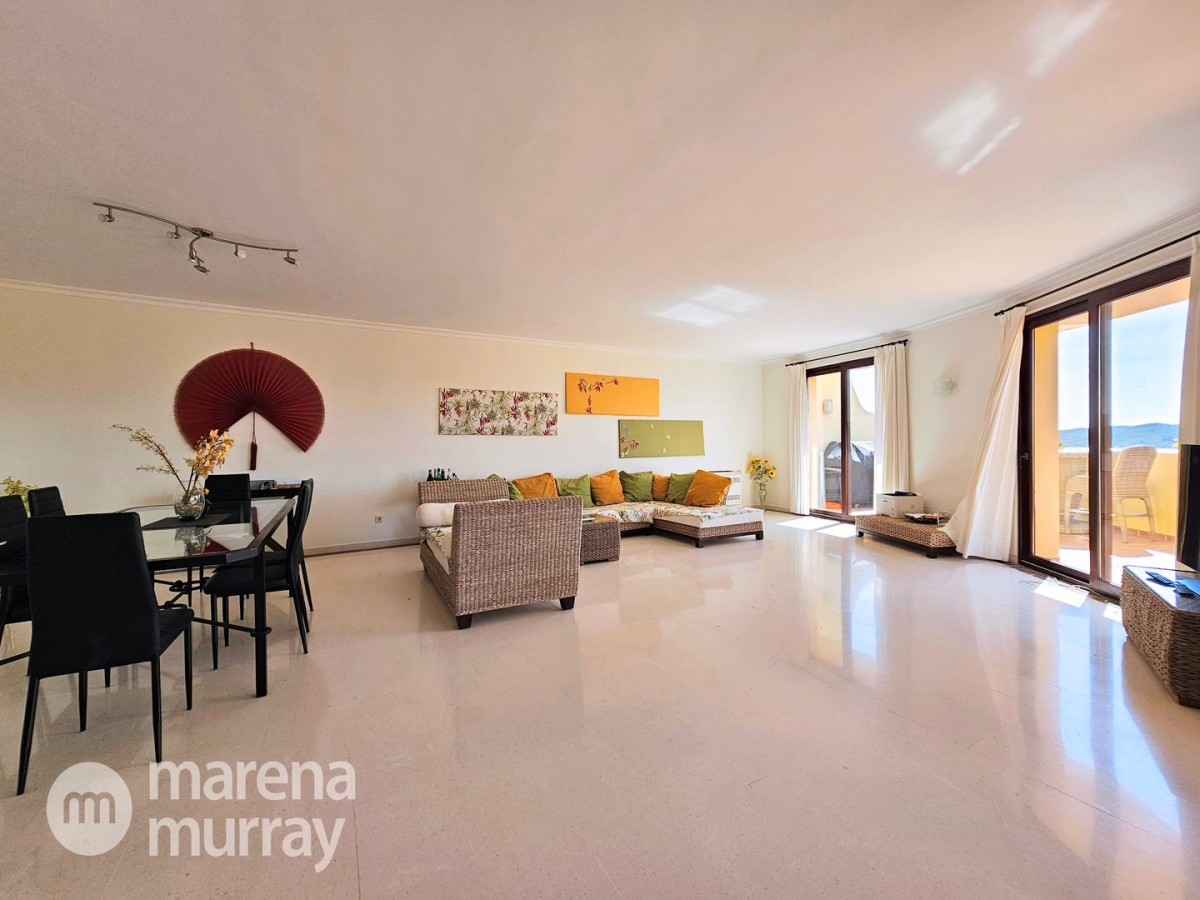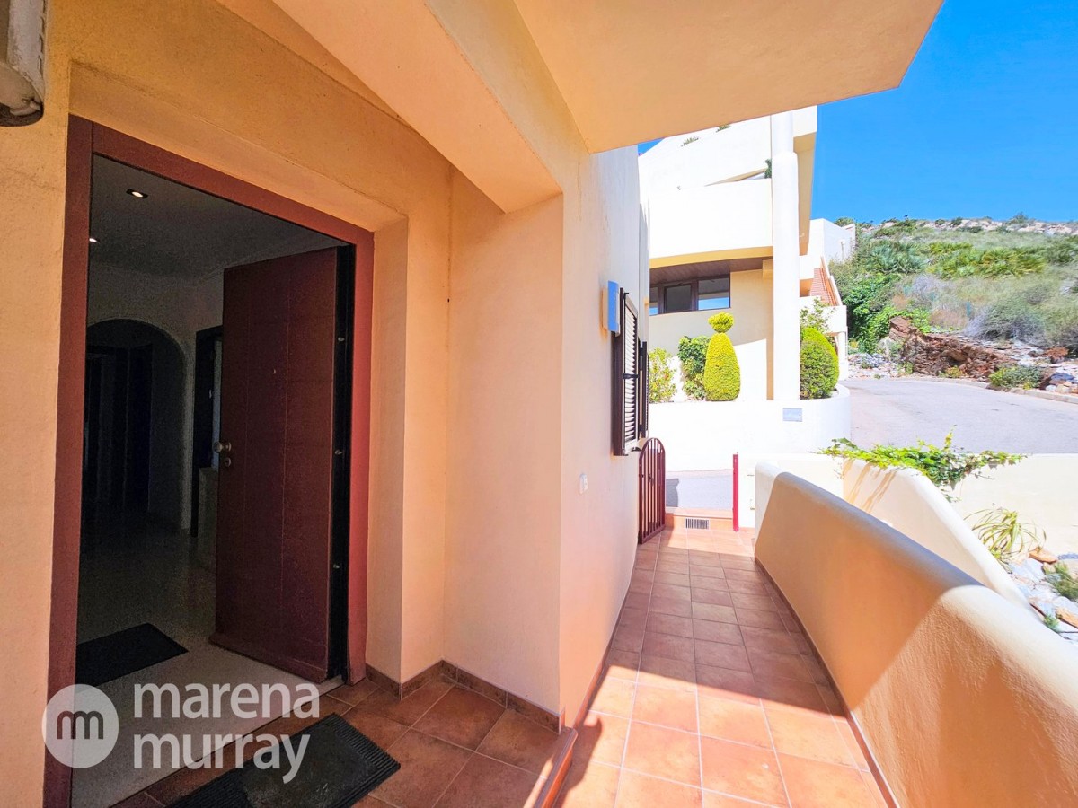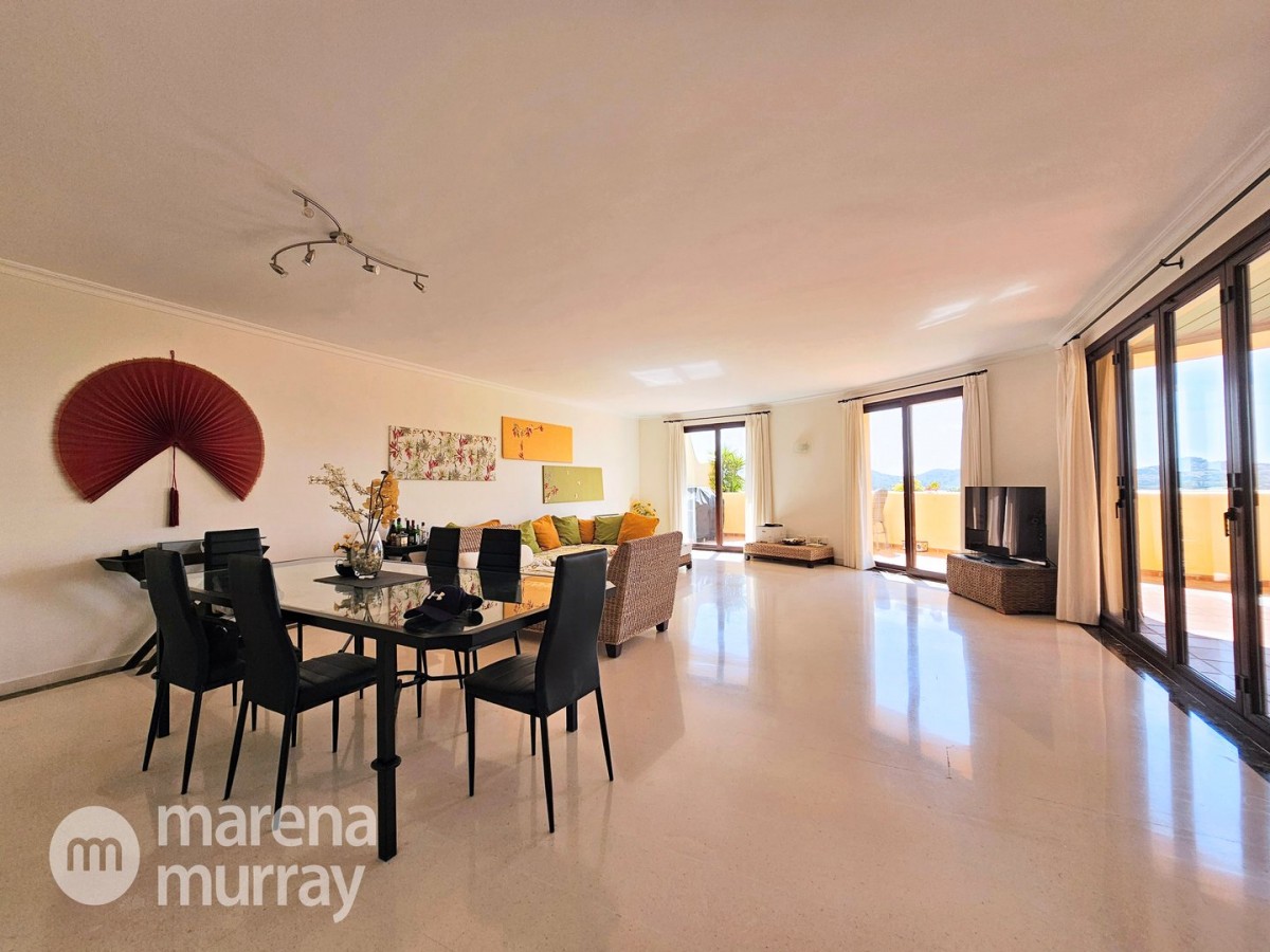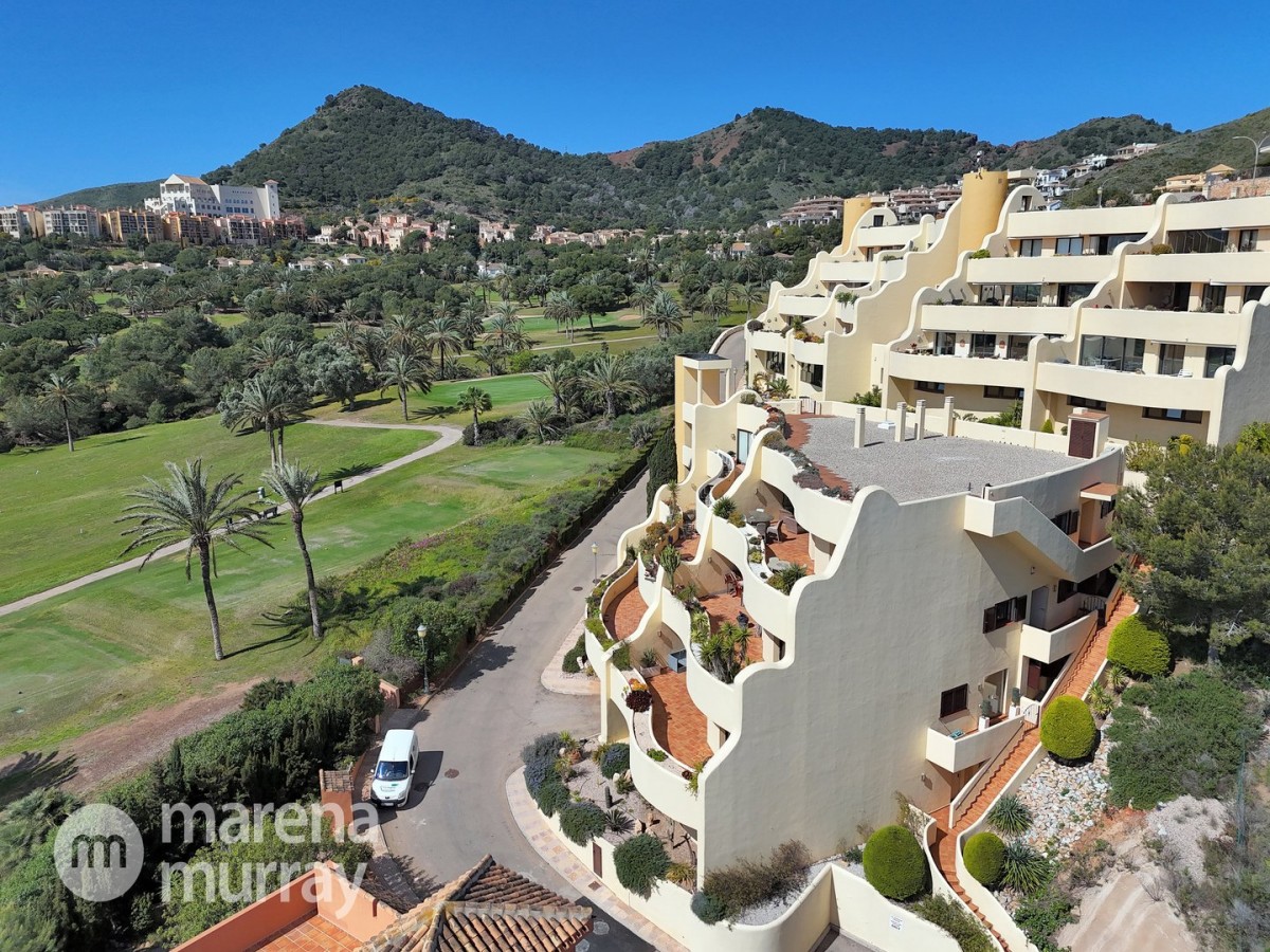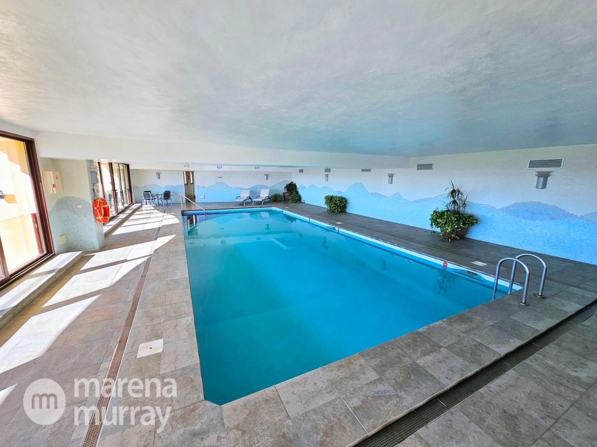 Perched at the top of the sought after Coto del Golf Terrazas community, this exceptional three bedroom, two bathroom apartment offers privacy, tranquility, and year round sunshine in the prestigious La Manga Club resort. Situated on the peaceful north side of the resort, the property enjoys the warmth of the winter sun while benefiting from a quiet residential setting and the intimacy of a small, well maintained community. The spacious interior is designed for comfort and effortless indoor outdoor living. The bright and airy living area is flooded with natural light through sliding doors that open directly onto a generous south facing sun terrace, the perfect space for relaxing, dining, and enjoying the beautiful golf course surroundings. The well appointed kitchen offers ample storage and generous workspace, ideal for entertaining guests. With direct access to the terrace, serving friends and family is both easy and enjoyable. The apartment comprises three good sized bedrooms and two bathrooms. The master suite features an ensuite bathroom and elegant French doors that open onto the south-facing terrace, allowing you to wake up to sunshine and golf views. Additional features include two allocated indoor parking spaces, with the flexibility to create a storage area within one space. Residents also enjoy access to a superb indoor heated swimming pool, complete with separate male and female changing facilities, all set against spectacular views of the golf course. This top floor residence combines privacy, light filled living spaces, and excellent amenities in one of La Manga Club’s most desirable communities, an ideal permanent home, or winter retreat.