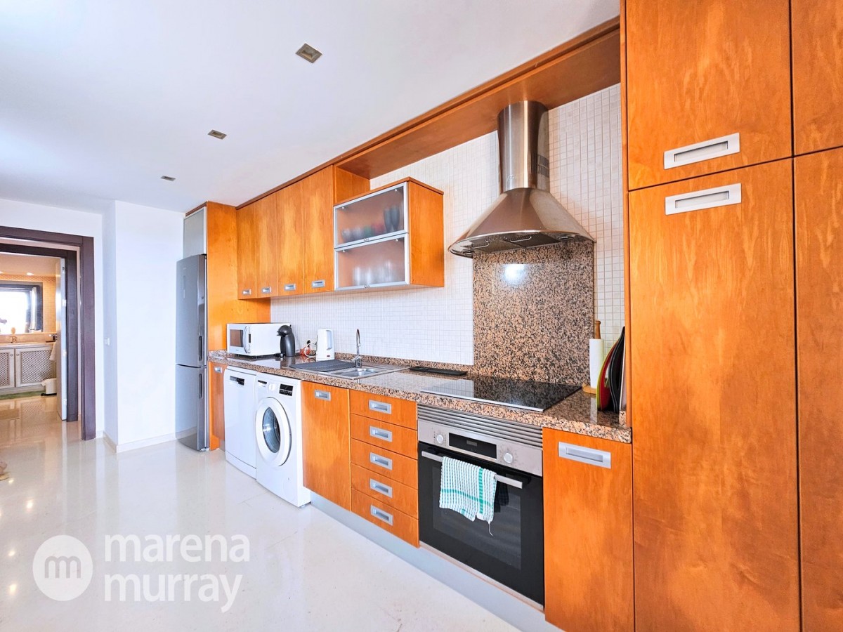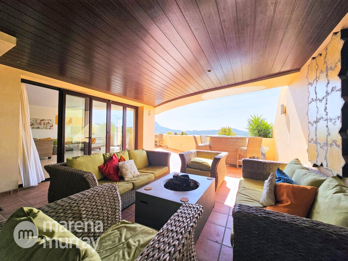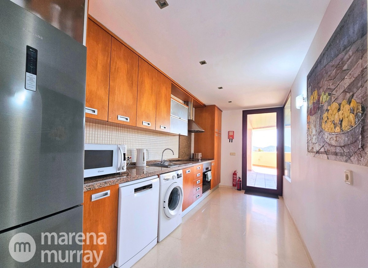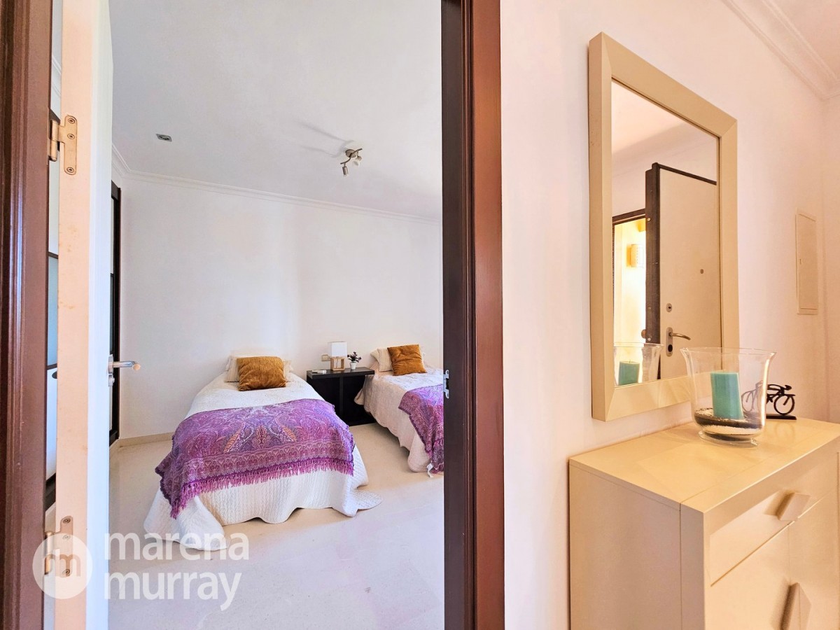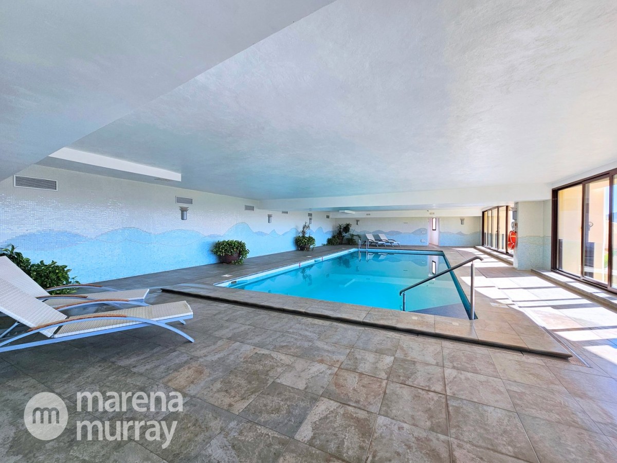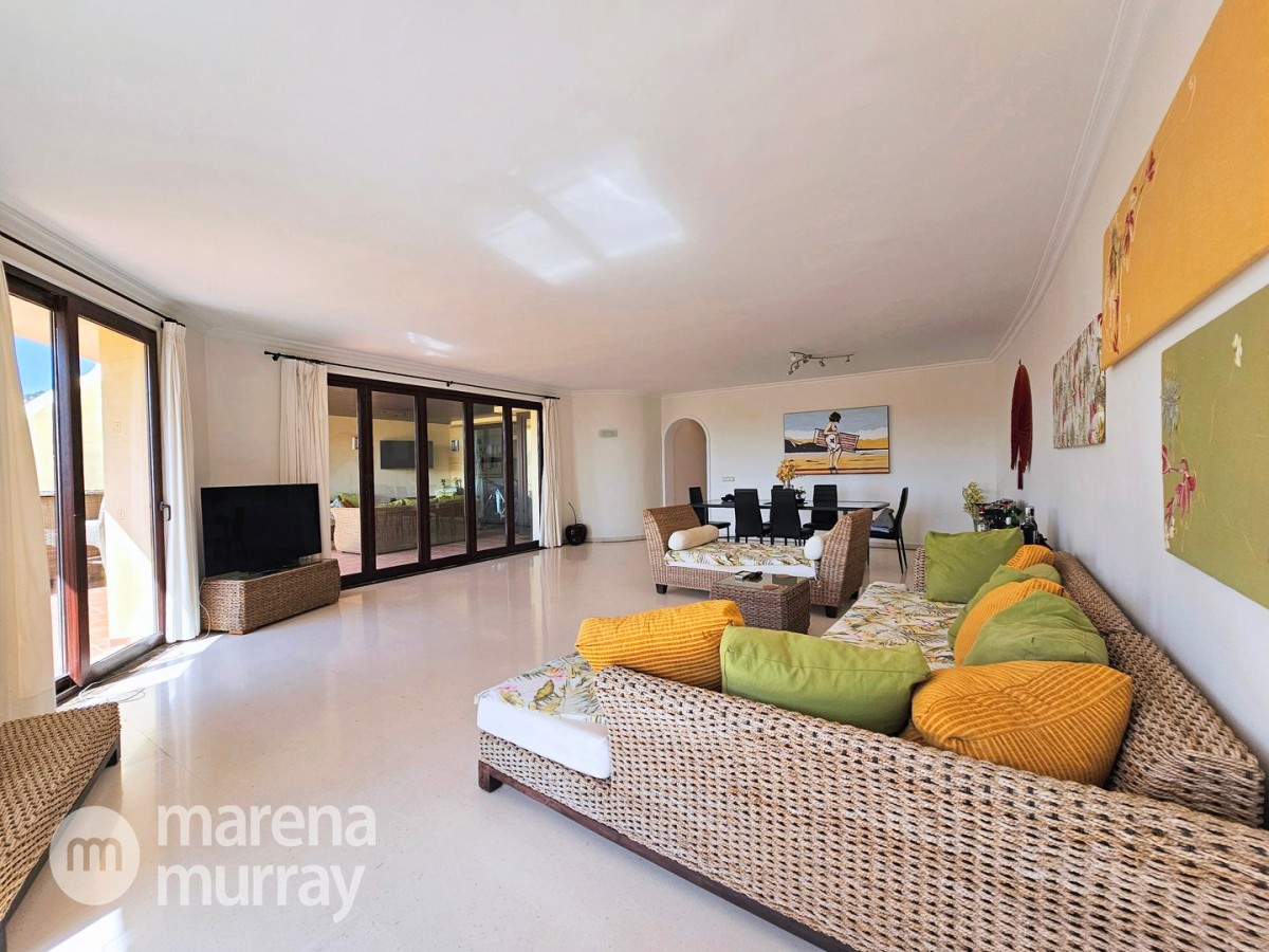 Perched at the top of the sought after Coto del Golf Terrazas community, this exceptional three bedroom, two bathroom apartment offers privacy, tranquility, and year round sunshine in the prestigious La Manga Club resort. Situated on the peaceful north side of the resort, the property enjoys the warmth of the winter sun while benefiting from a quiet residential setting and the intimacy of a small, well maintained community. The spacious interior is designed for comfort and effortless indoor outdoor living. The bright and airy living area is flooded with natural light through sliding doors that open directly onto a generous south facing sun terrace, the perfect space for relaxing, dining, and enjoying the beautiful golf course surroundings. The well appointed kitchen offers ample storage and generous workspace, ideal for entertaining guests. With direct access to the terrace, serving friends and family is both easy and enjoyable. The apartment comprises three good sized bedrooms and two bathrooms. The master suite features an ensuite bathroom and elegant French doors that open onto the south-facing terrace, allowing you to wake up to sunshine and golf views. Additional features include two allocated indoor parking spaces, with the flexibility to create a storage area within one space. Residents also enjoy access to a superb indoor heated swimming pool, complete with separate male and female changing facilities, all set against spectacular views of the golf course. This top floor residence combines privacy, light filled living spaces, and excellent amenities in one of La Manga Club’s most desirable communities, an ideal permanent home, or winter retreat.