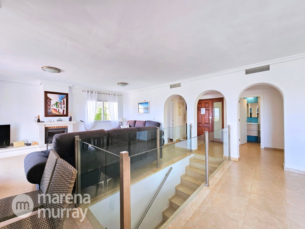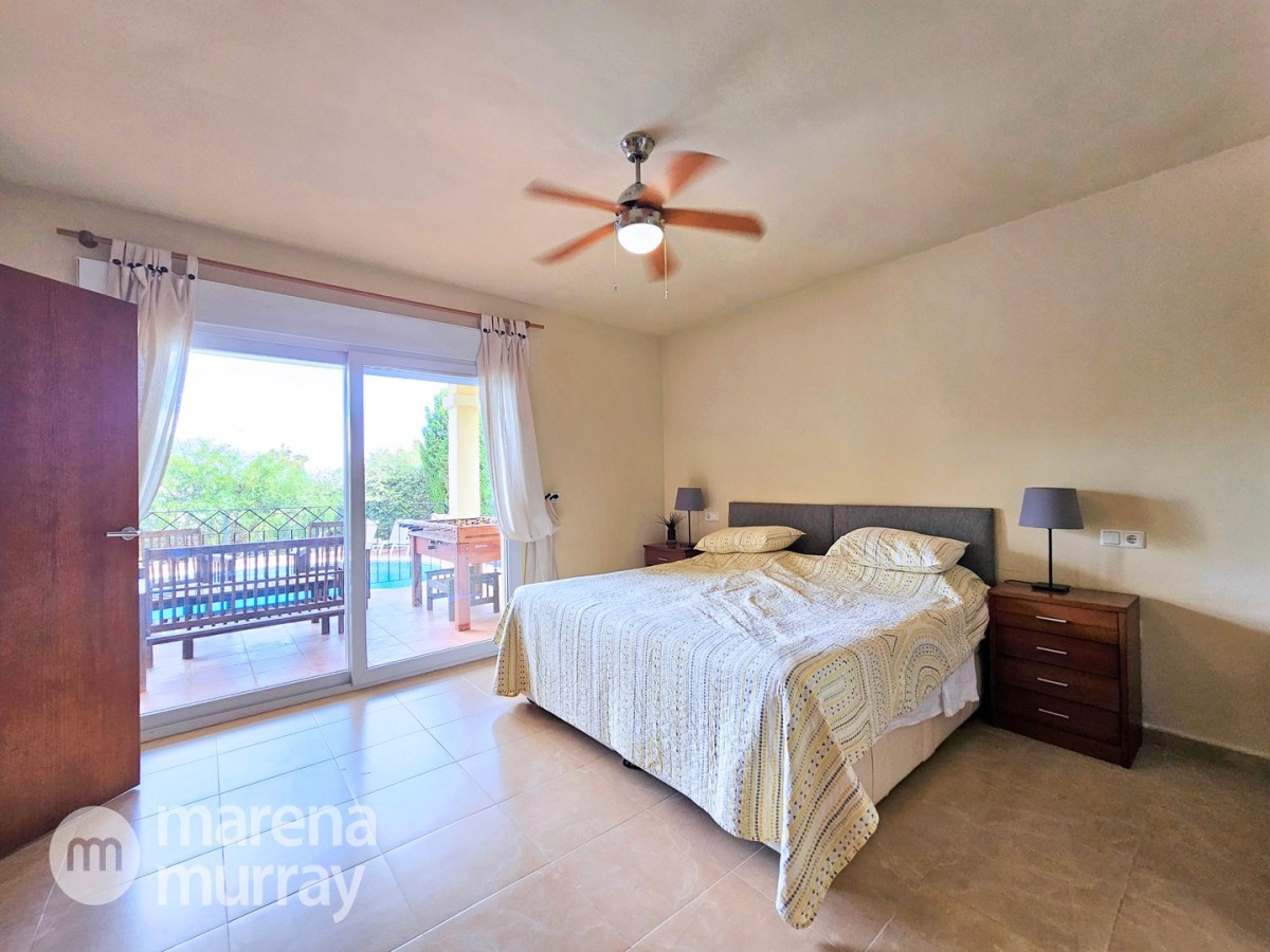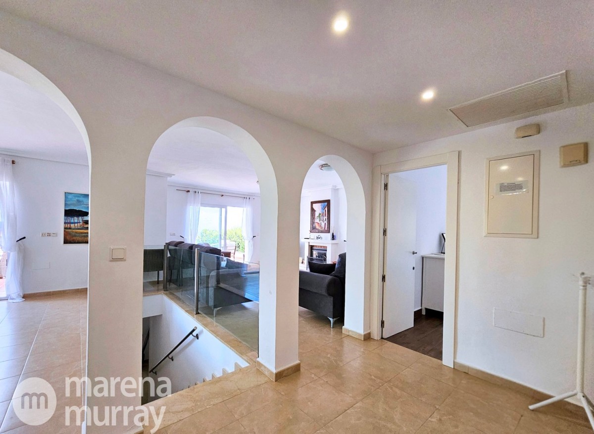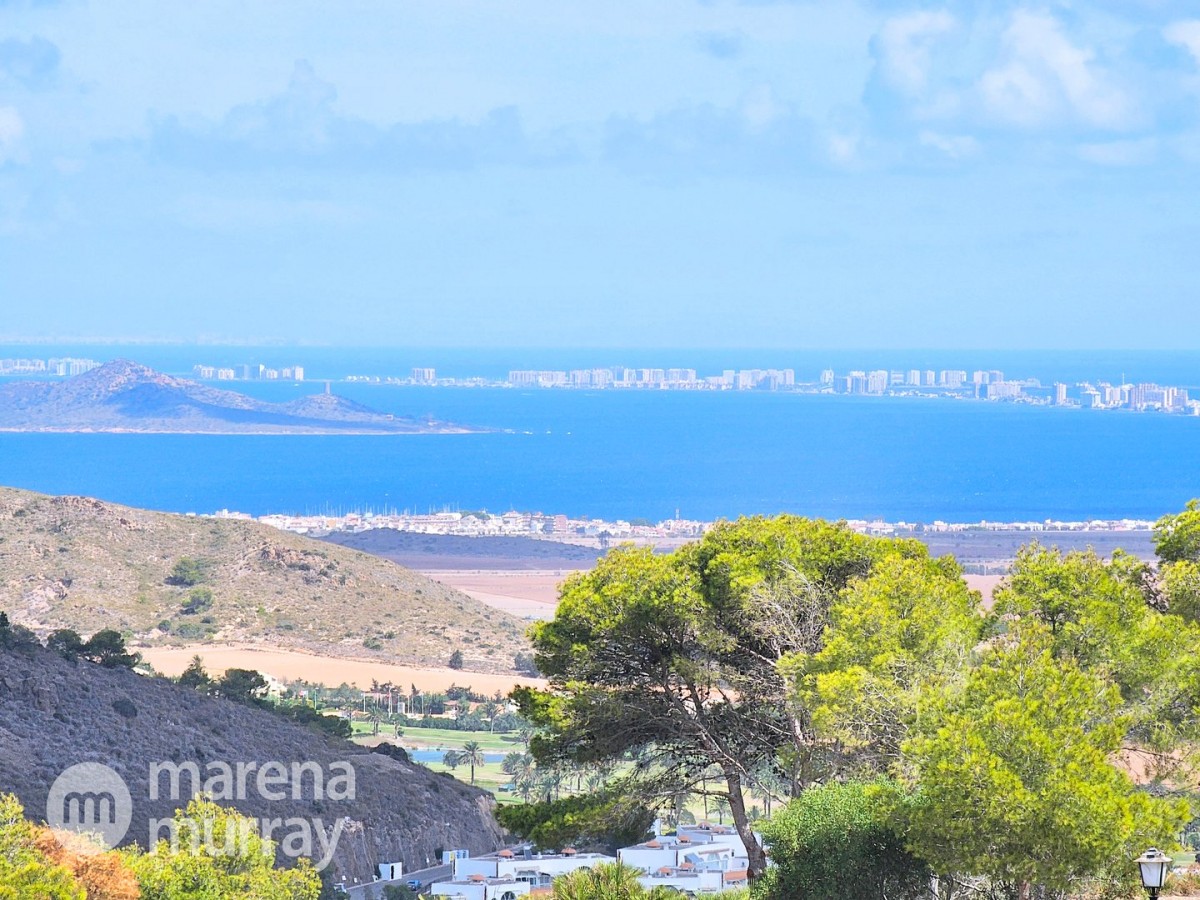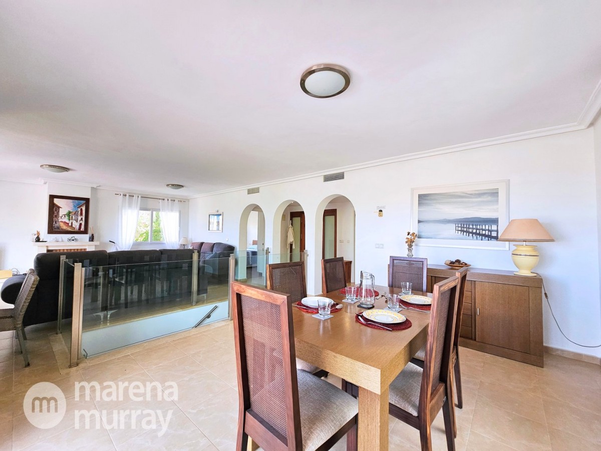 This modern four bedroom villa is located in the sought after Monte León community, set in an elevated position with wide reaching views across La Manga Club and the surrounding mountains. The interior is bright and contemporary, with an open plan layout and plenty of natural light throughout. The main living area opens onto a spacious terrace, which leads up to a generous solarium, ideal for relaxing or entertaining. From the main terrace, a staircase leads down to a second terrace where you'll find a private swimming pool and additional space for outdoor seating or sunbathing. The master bedroom features an ensuite bathroom and has direct access to the pool terrace through sliding doors. Both guest bedrooms, on the lower level, also have ensuite bathrooms with walk-in showers, providing privacy and comfort for family or visitors. A fourth bedroom is located on the entry level, next to a separate shower room. The villa is in excellent condition and offers modern finishes throughout. Its position in Monte León provides peace and privacy, while still being not too far from the amenities of La Manga Club. This property is well suited as a full time home or holiday home.