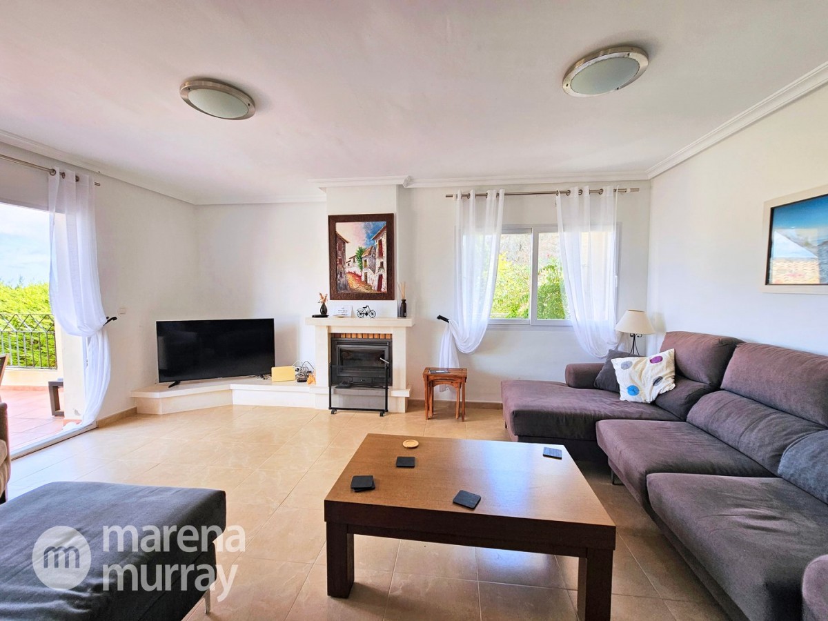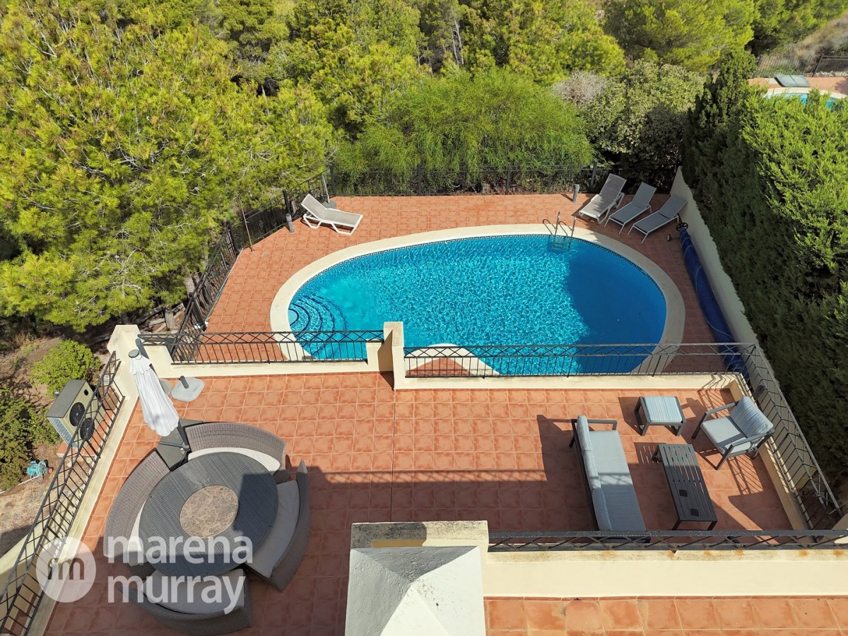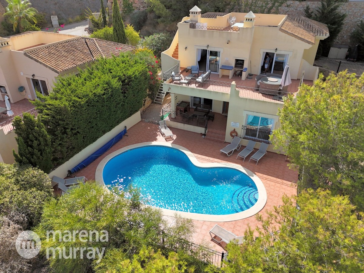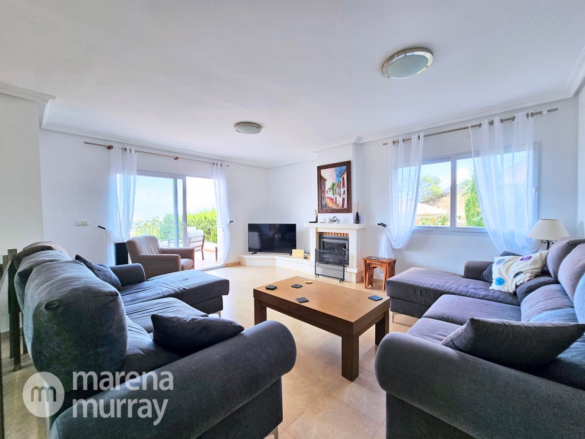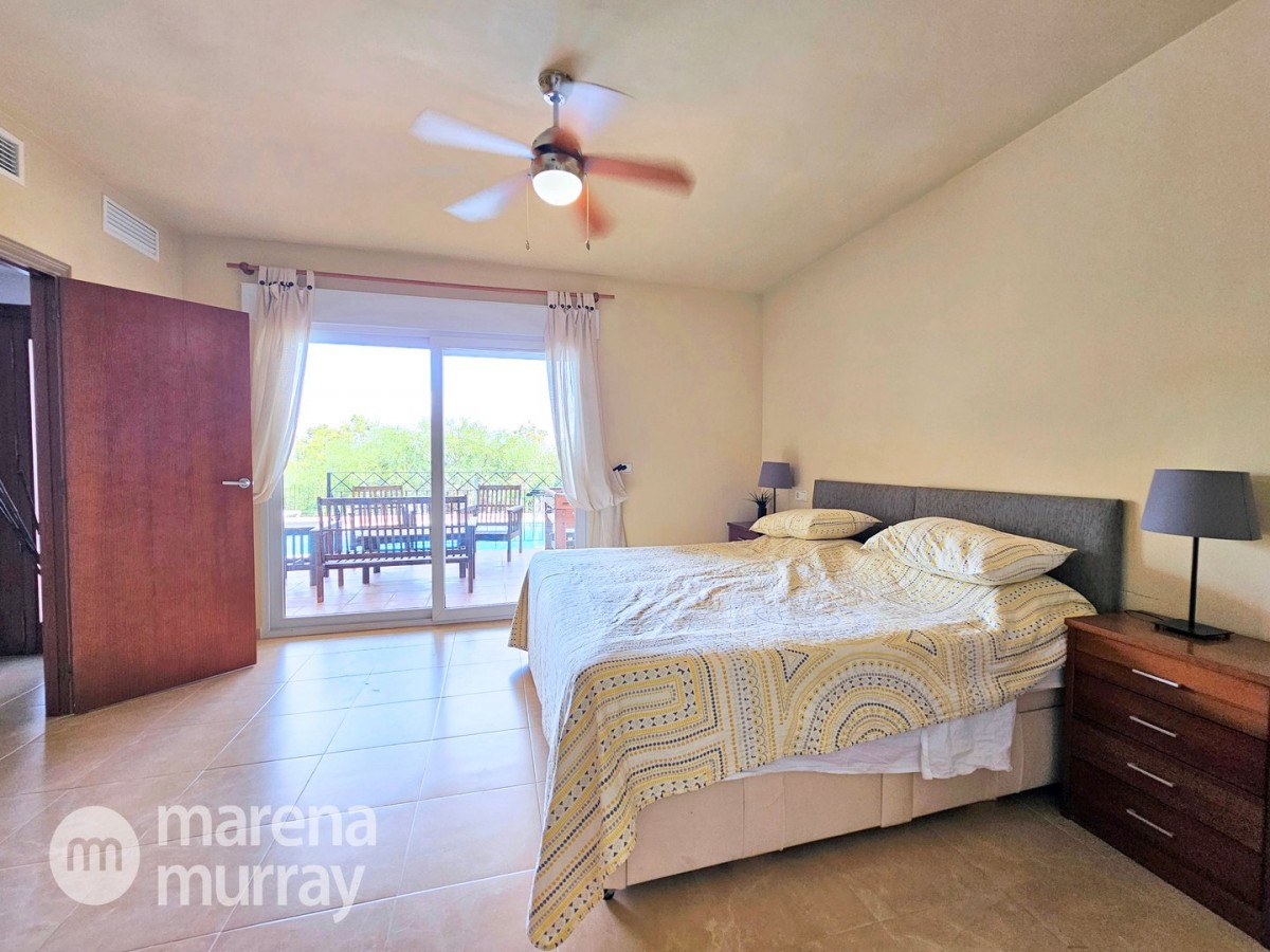 This modern four bedroom villa is located in the sought after Monte León community, set in an elevated position with wide reaching views across La Manga Club and the surrounding mountains. The interior is bright and contemporary, with an open plan layout and plenty of natural light throughout. The main living area opens onto a spacious terrace, which leads up to a generous solarium, ideal for relaxing or entertaining. From the main terrace, a staircase leads down to a second terrace where you'll find a private swimming pool and additional space for outdoor seating or sunbathing. The master bedroom features an ensuite bathroom and has direct access to the pool terrace through sliding doors. Both guest bedrooms, on the lower level, also have ensuite bathrooms with walk-in showers, providing privacy and comfort for family or visitors. A fourth bedroom is located on the entry level, next to a separate shower room. The villa is in excellent condition and offers modern finishes throughout. Its position in Monte León provides peace and privacy, while still being not too far from the amenities of La Manga Club. This property is well suited as a full time home or holiday home.