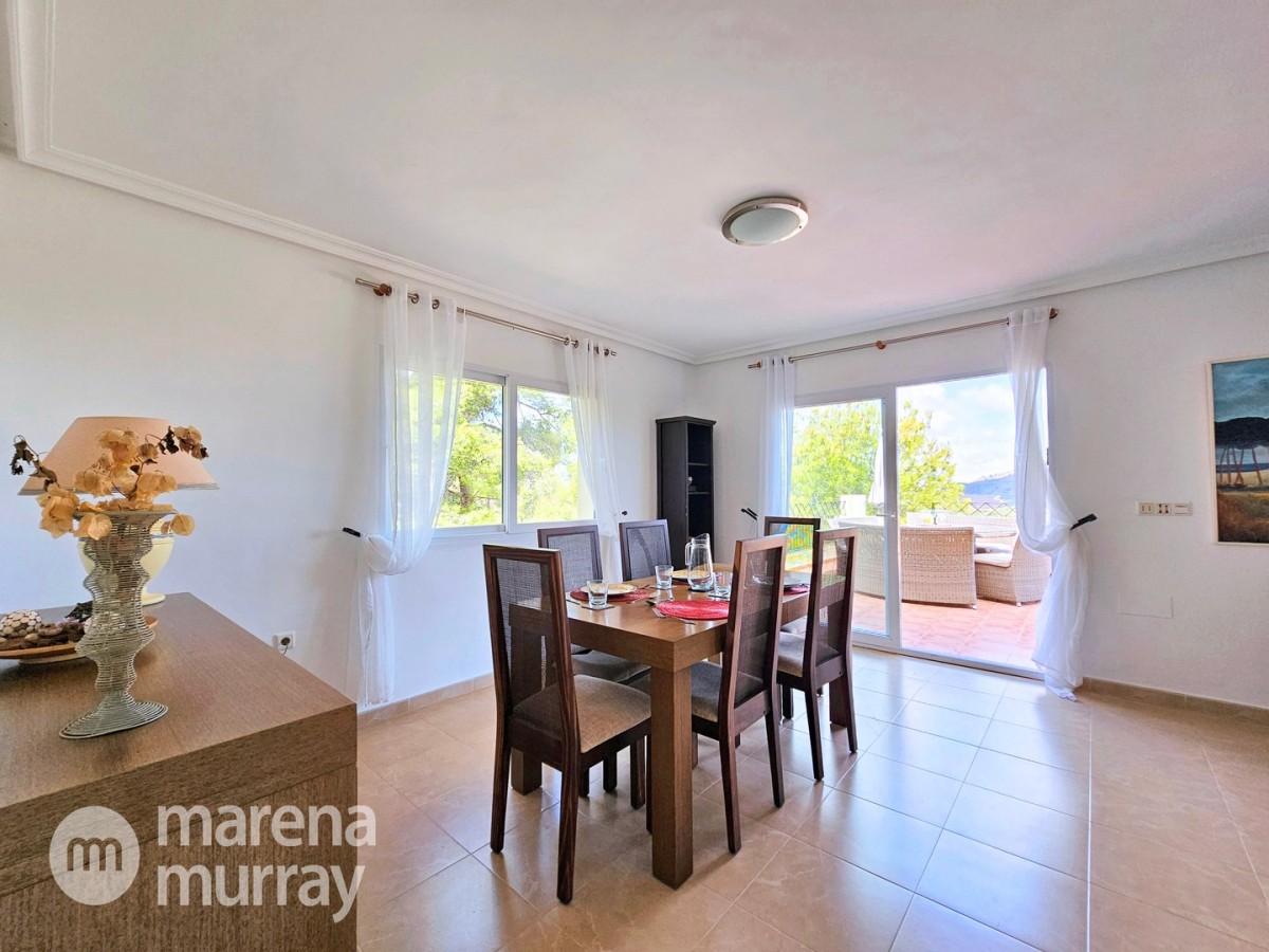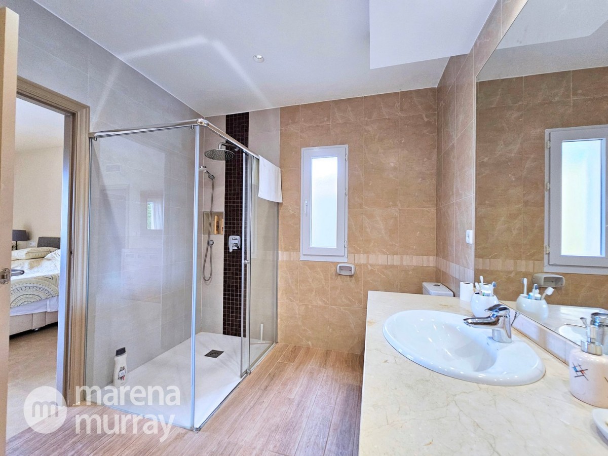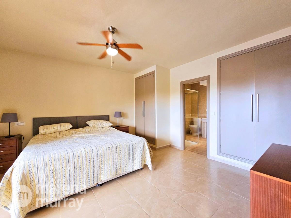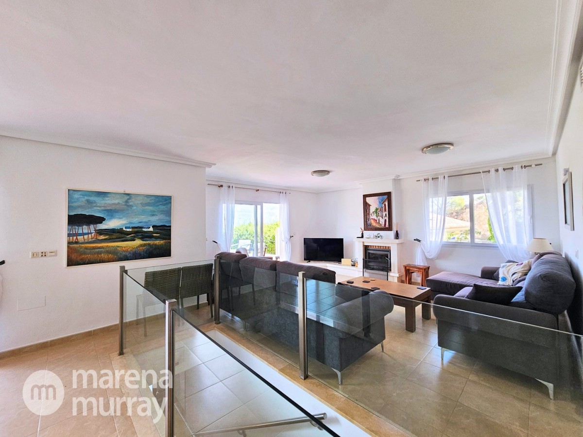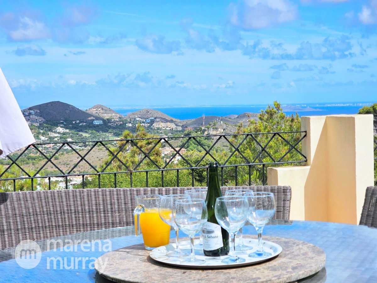 This modern four bedroom villa is located in the sought after Monte León community, set in an elevated position with wide reaching views across La Manga Club and the surrounding mountains. The interior is bright and contemporary, with an open plan layout and plenty of natural light throughout. The main living area opens onto a spacious terrace, which leads up to a generous solarium, ideal for relaxing or entertaining. From the main terrace, a staircase leads down to a second terrace where you'll find a private swimming pool and additional space for outdoor seating or sunbathing. The master bedroom features an ensuite bathroom and has direct access to the pool terrace through sliding doors. Both guest bedrooms, on the lower level, also have ensuite bathrooms with walk-in showers, providing privacy and comfort for family or visitors. A fourth bedroom is located on the entry level, next to a separate shower room. The villa is in excellent condition and offers modern finishes throughout. Its position in Monte León provides peace and privacy, while still being not too far from the amenities of La Manga Club. This property is well suited as a full time home or holiday home.