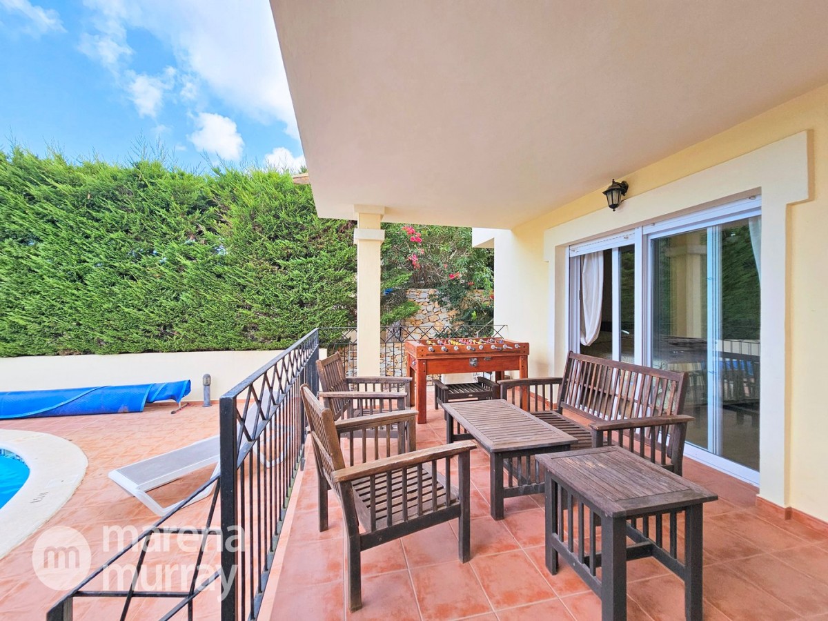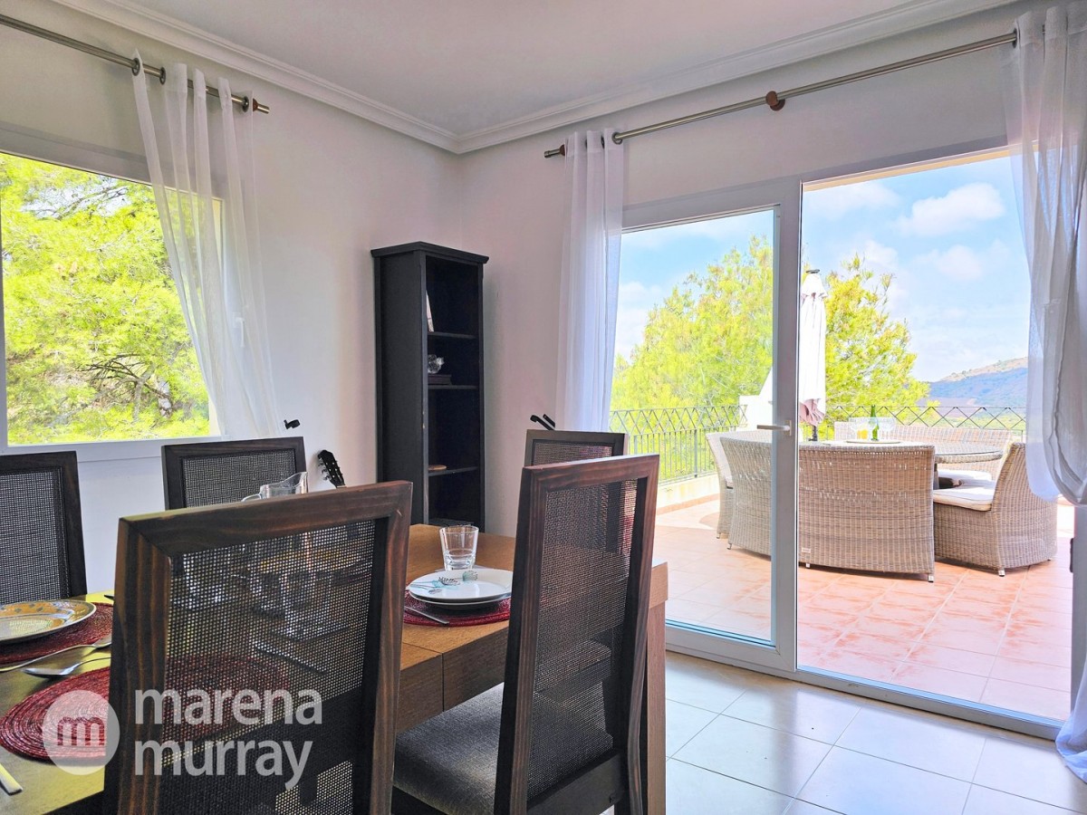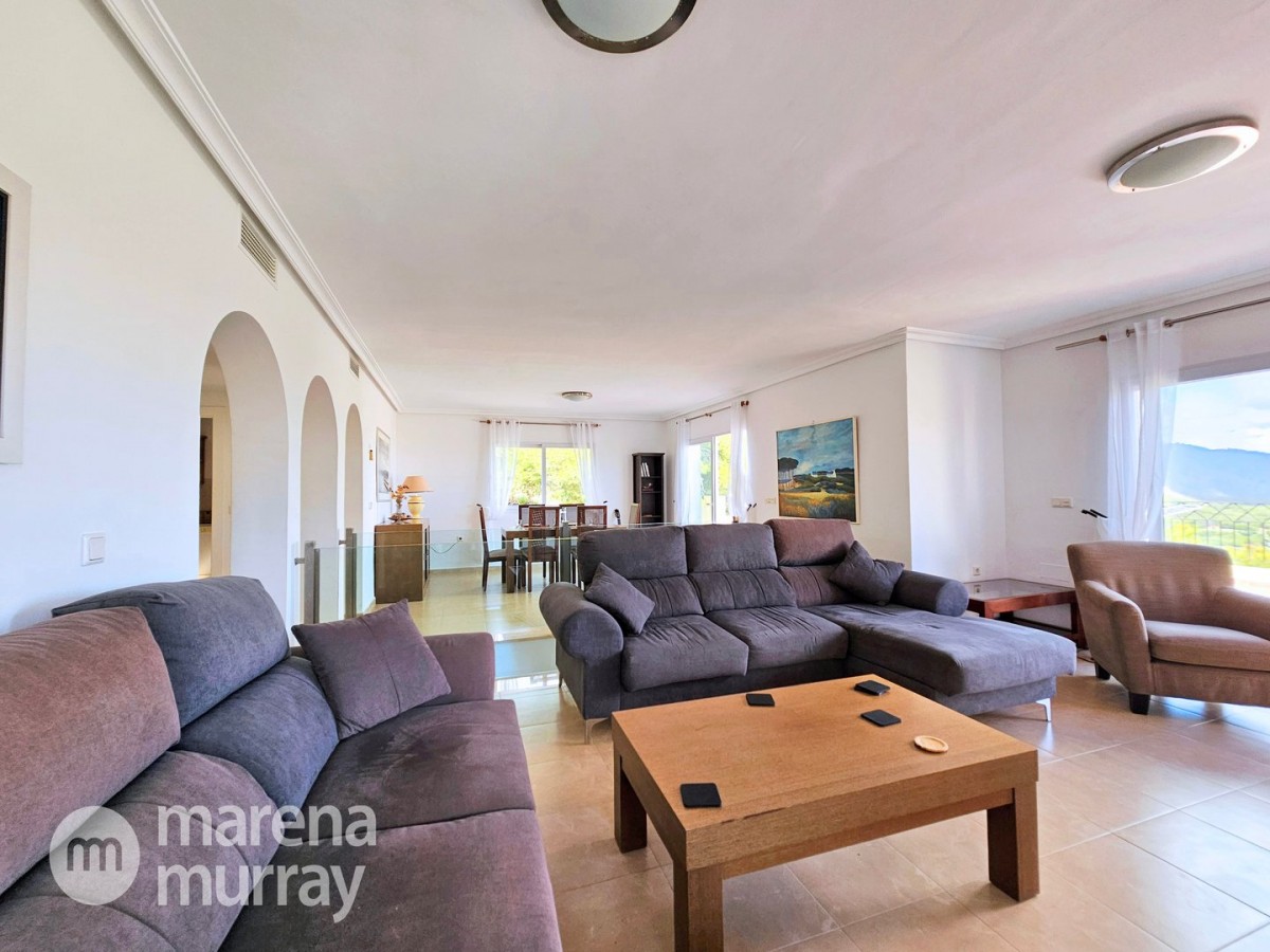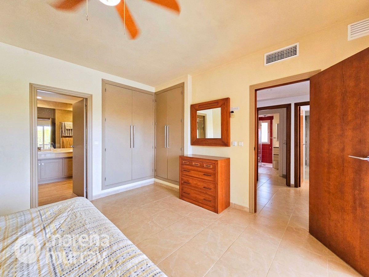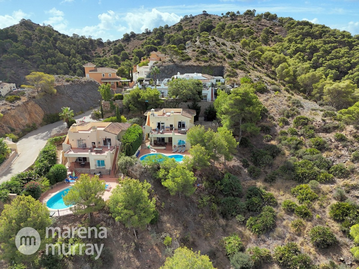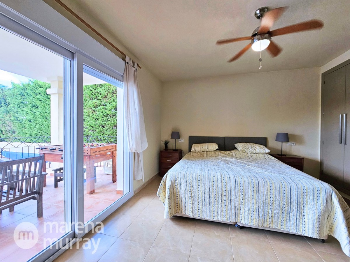 This modern four bedroom villa is located in the sought after Monte León community, set in an elevated position with wide reaching views across La Manga Club and the surrounding mountains. The interior is bright and contemporary, with an open plan layout and plenty of natural light throughout. The main living area opens onto a spacious terrace, which leads up to a generous solarium, ideal for relaxing or entertaining. From the main terrace, a staircase leads down to a second terrace where you'll find a private swimming pool and additional space for outdoor seating or sunbathing. The master bedroom features an ensuite bathroom and has direct access to the pool terrace through sliding doors. Both guest bedrooms, on the lower level, also have ensuite bathrooms with walk-in showers, providing privacy and comfort for family or visitors. A fourth bedroom is located on the entry level, next to a separate shower room. The villa is in excellent condition and offers modern finishes throughout. Its position in Monte León provides peace and privacy, while still being not too far from the amenities of La Manga Club. This property is well suited as a full time home or holiday home.
